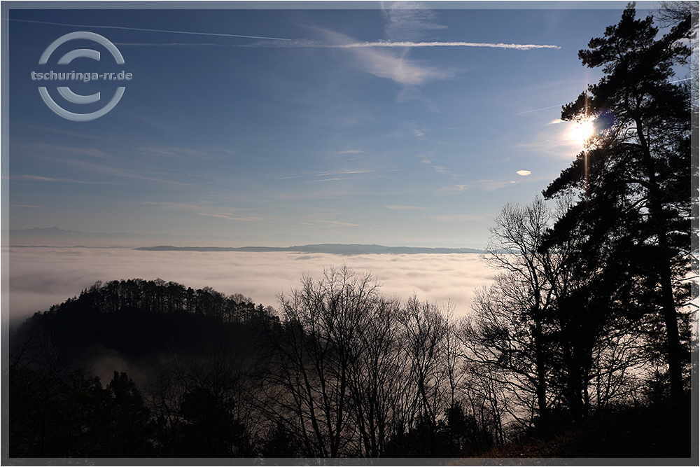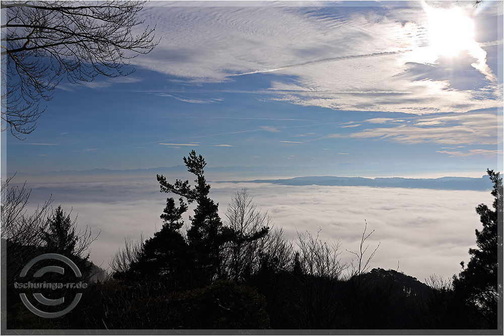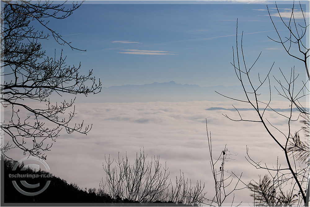 | Ausblick von der Zimmerwiese bei Sipplingen über den Bodensee, der vom Nebel verdeckt ist. Im Hintergrund sind die Alpen zu sehen. | ||
