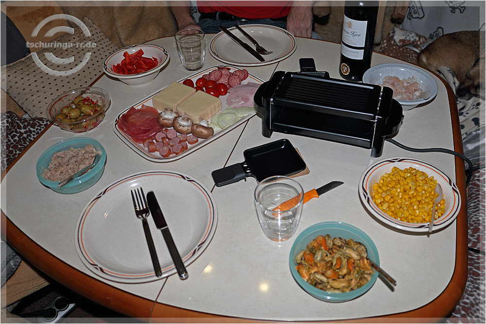 | Dann wird das Raclette vorbereitet und wir schlemmen wunderbar bei einer schönen Flasche Rotwein. | ||