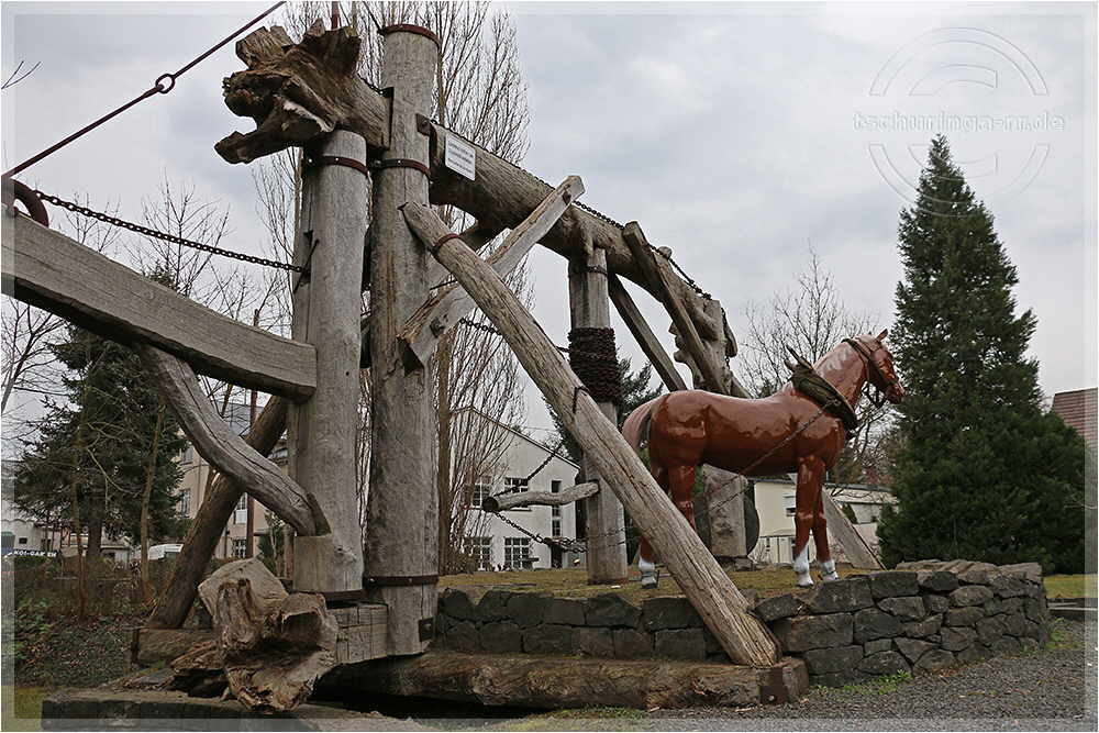 | Mit solchen Göpeln, die mit Hilfe von Pferden betrieben wurden, hat man die schweren Mühlsteine aus dem Keller gehoben. | ||
