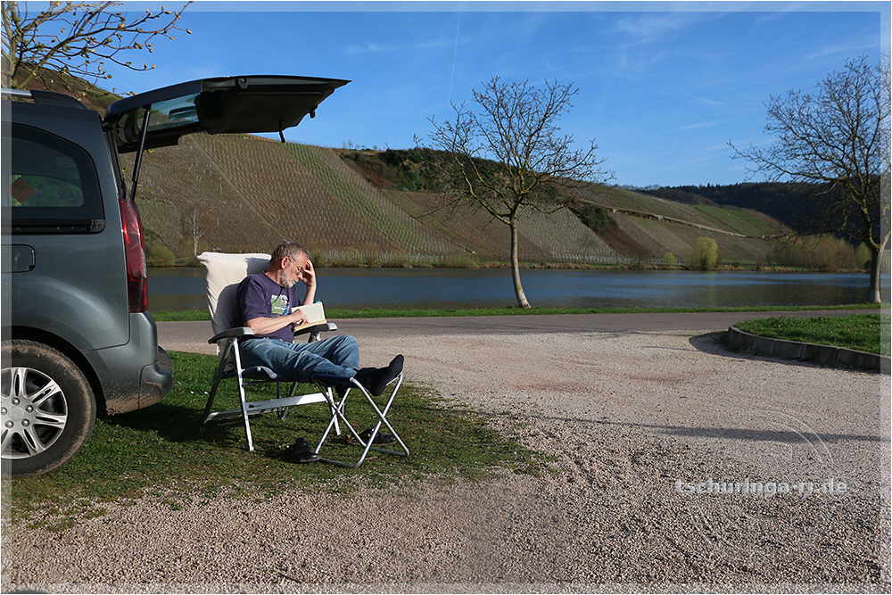 | Friedbert die Campingstühle raus und wir genießen im Windschatten von Auto und Wohnmobil die warme Märzsonne. | ||