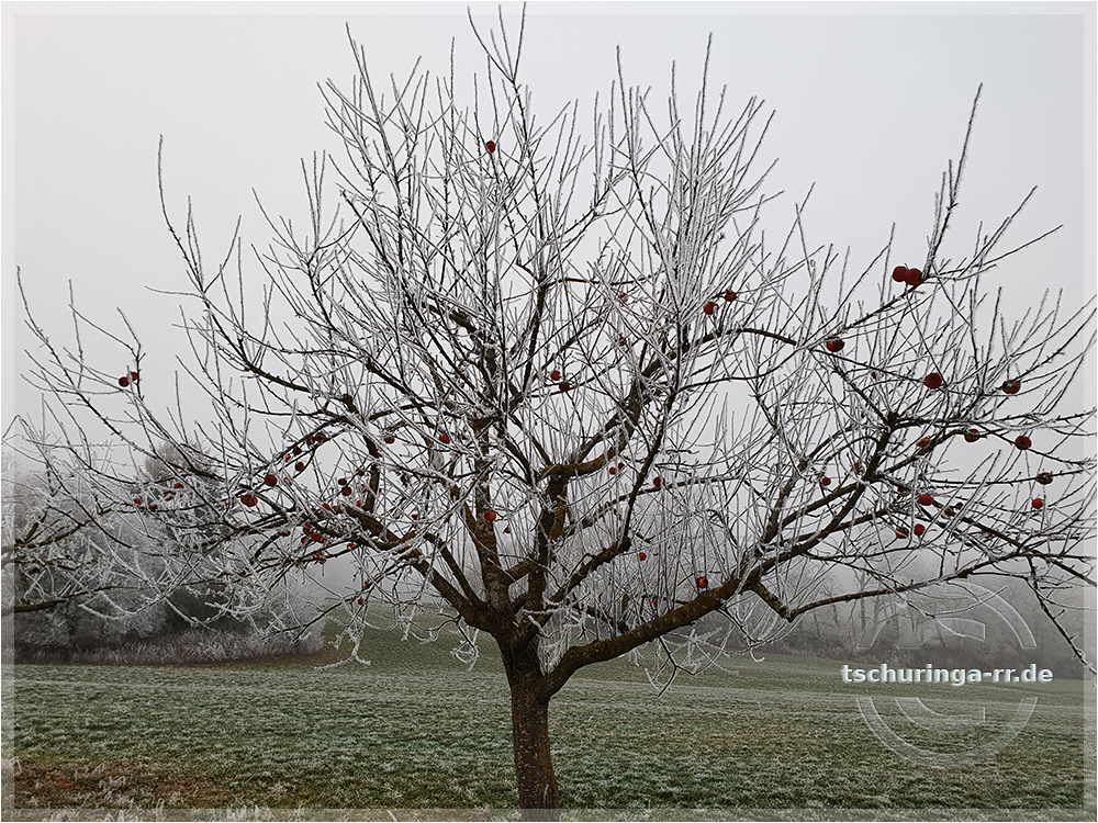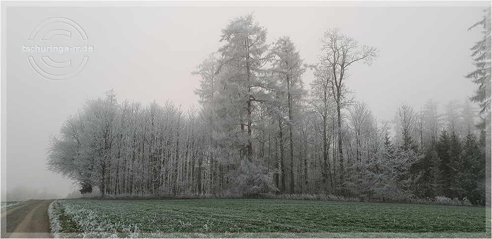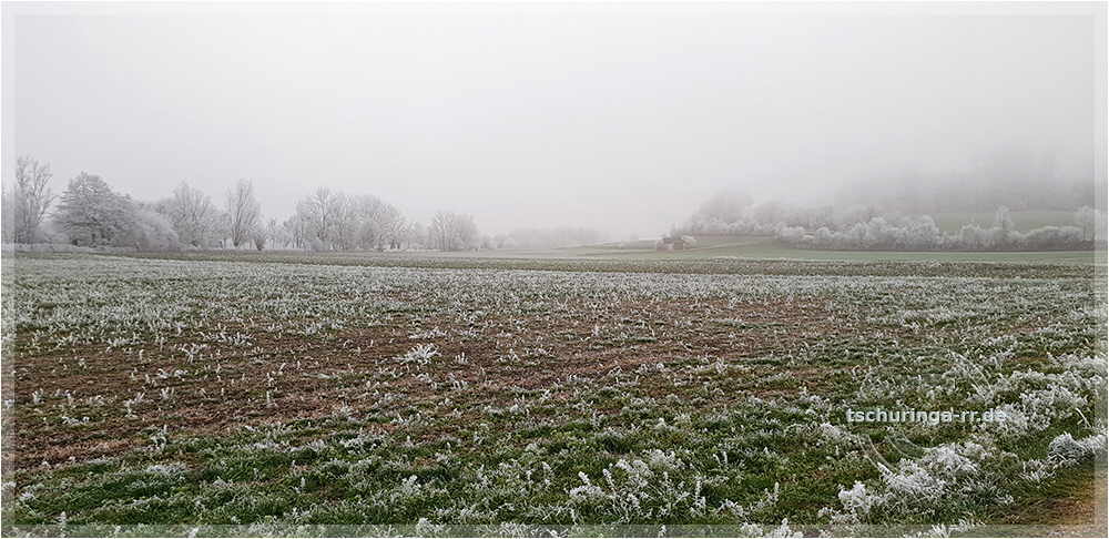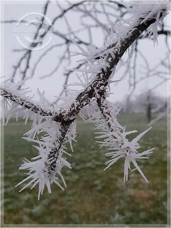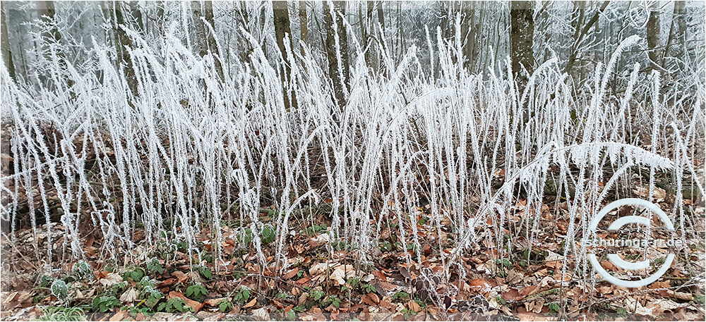 | Der Nebel gefriert an Ästen, Blättern und Halmen | ||