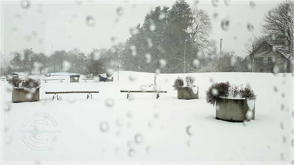 | Heute Nacht hat es geschneit und es schneit auch weiterhin. Der Schnee ist recht nass und kommt irgendwie von allen Seiten. | ||