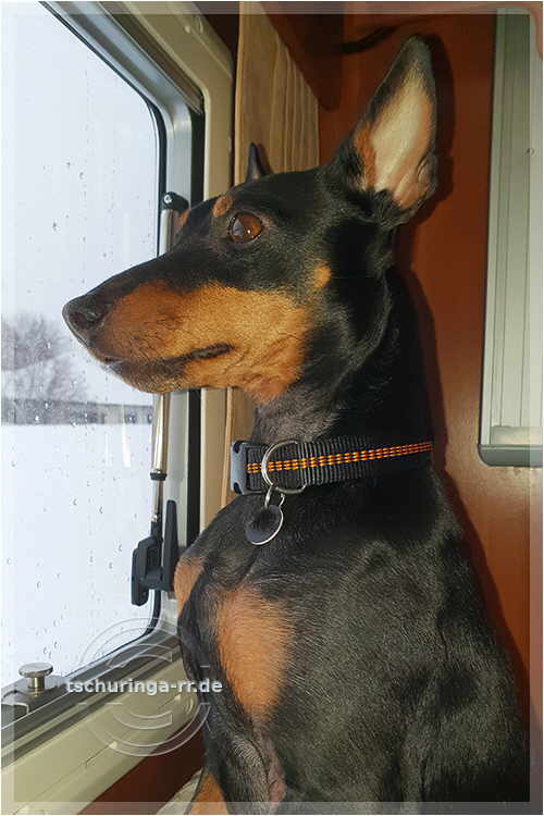 | Während Herrchen oben auf dem Wohnmobil Schnee schippt, beguckt Lennox sich die weiße Pracht lieber von drinnen. | ||