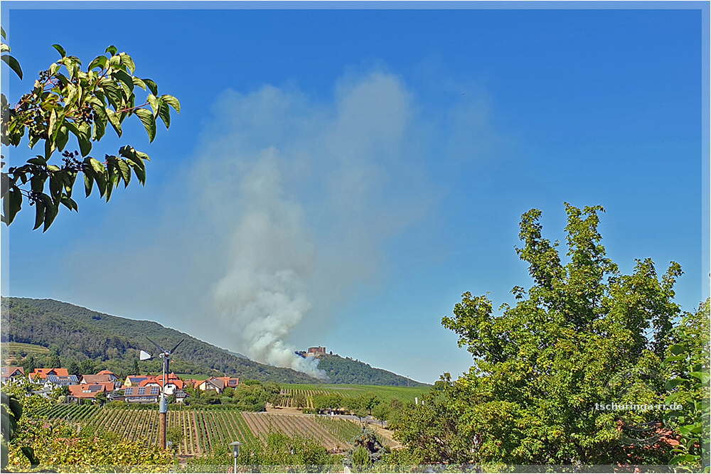 Im Pfälzer Wald bei Neustadt unterhalb des Hambacher Schlosses brennen etwa acht Hektar Wald. Abends ist auch ein Löschhubschrauber im Einsatz. |