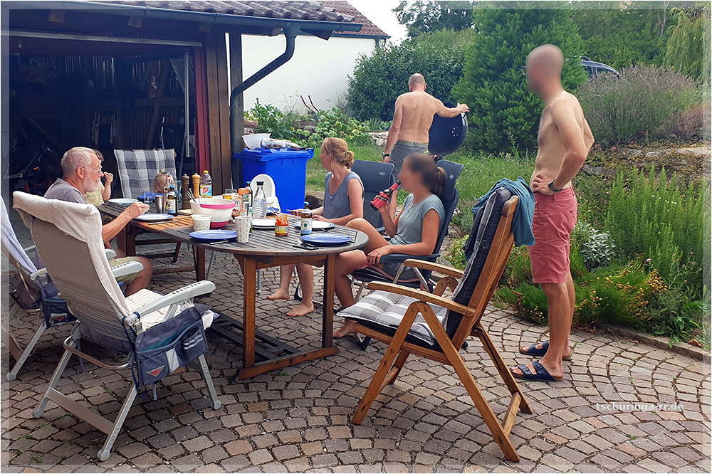 | Gemeinsames Grillen. Wir mussten dann doch noch in die Garage umziehen. | ||