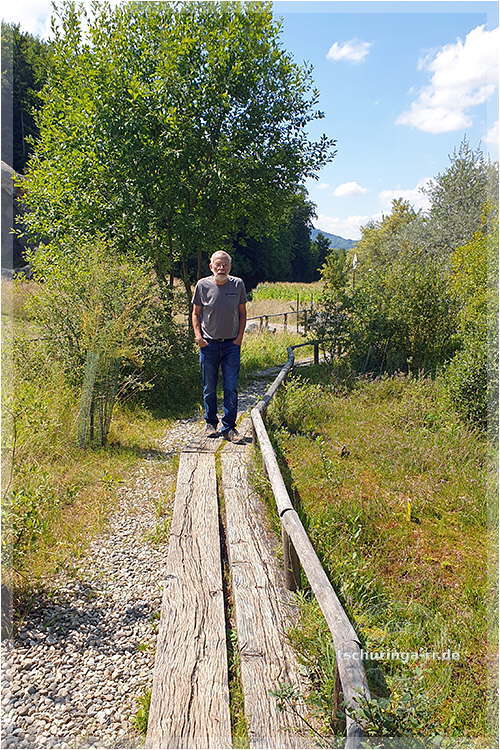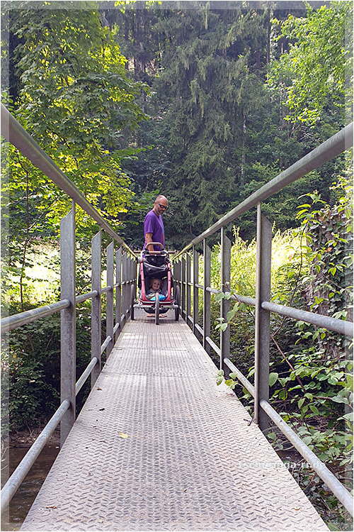| Der Kinderwagen passt so eben über die Brücke | ||