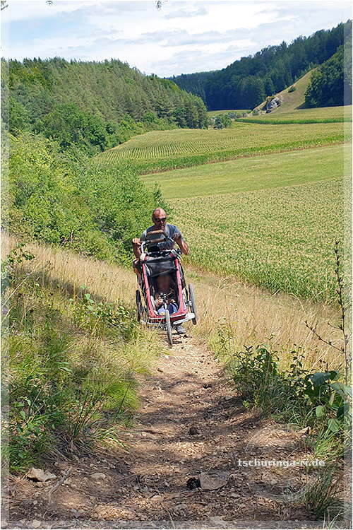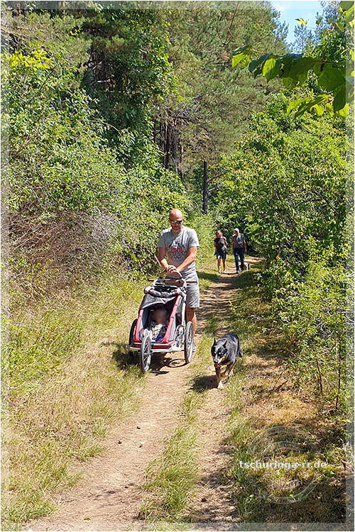 | Steiles Stück. Andreas jongliert den Kinderwagen auf zwei Rädern bis oben hin. | ||