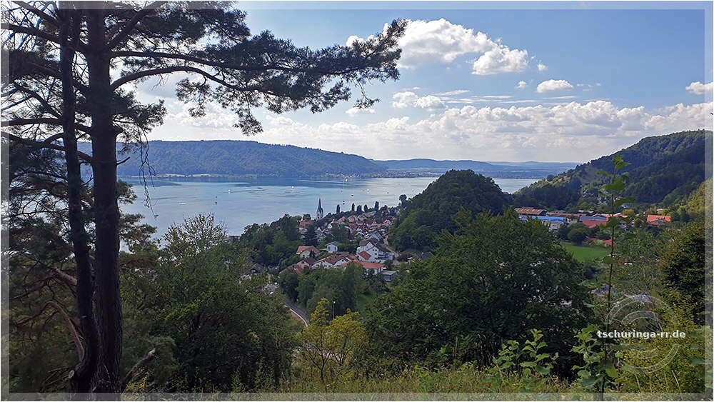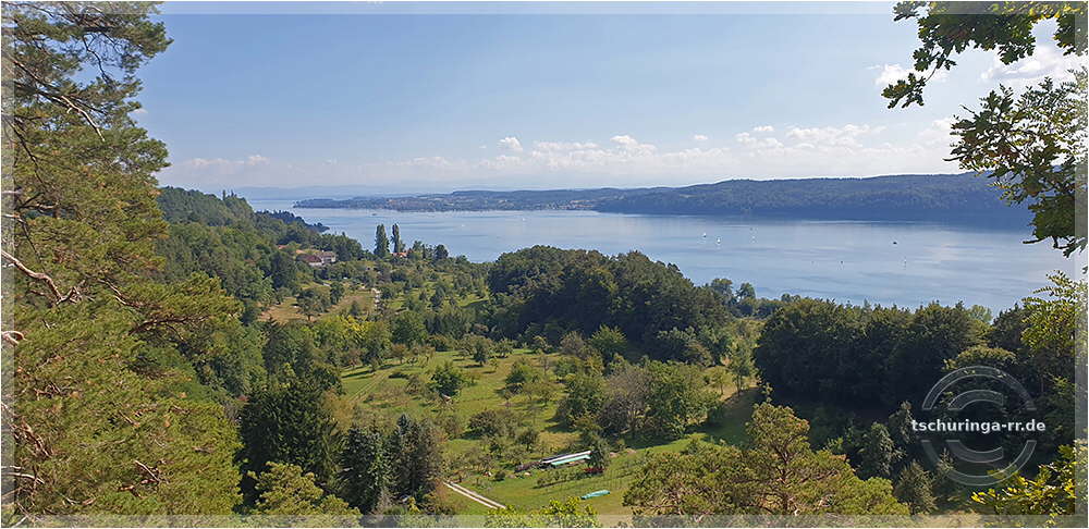 Friedbert dreht bereits früh am Morgen eine noch recht frische Runde mit Millaa durch den Wald. Nach dem Mittagessen fahren wir in Richtung des Sipplinger Dreiecks und laufen am Rotweilerberg mit den Jungs zu den "Sieben Churfirsten". Das sind pfeilerartige, zwischen fünf und sieben Meter hohe Sandsteinfelsen, die nach der Eiszeit durch Erosion entstanden sind. Von dort aus geht es noch ein Stück weiter, den Berg hoch, bis zu einem Aussichtspunkt, von wo aus man einen tollen Blick über den Bodensee hat. |