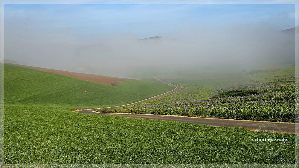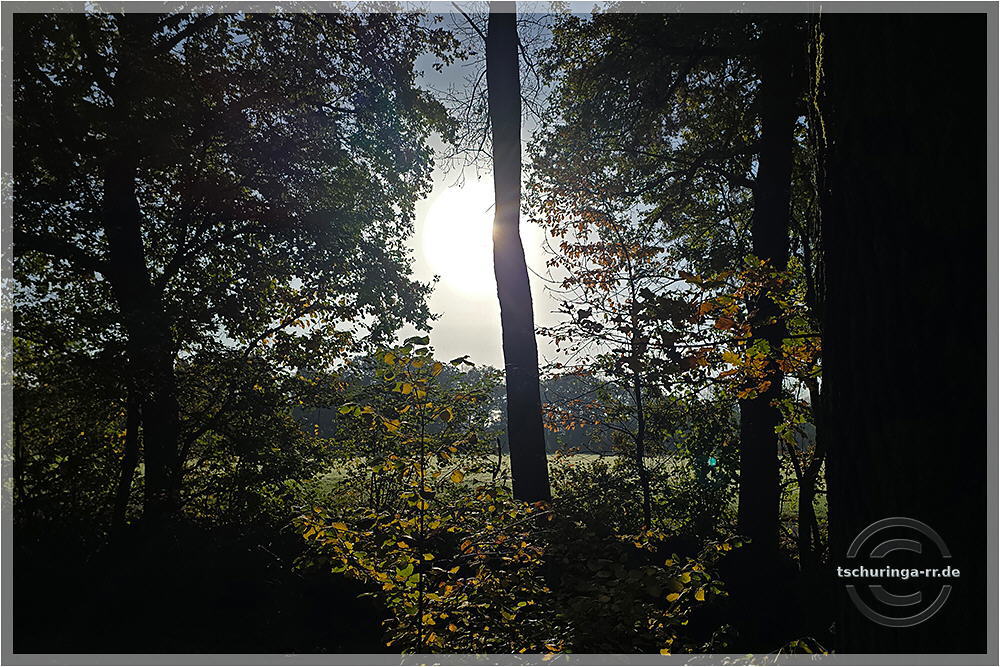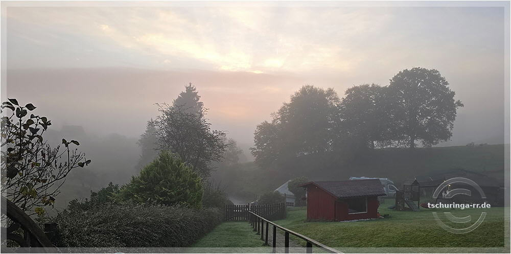 Nach dem Frühstück wandern wir auf nebeligen Wegen, über die Straße, denn die Wiesenwege sind pitschnass, hoch zur Kugelsburg. Der sich langsam lichtende Nebel ist interessant und mystisch zugleich. Käsekuchen und Kaffee gibt es im Anschluss an die Wanderung im Sonnenschein hinter dem Wohnmobil. Anderthalb Kilometer sind es zu einem Wanderparkplatz, von wo aus wir den Waldlehrpfad Steigerhütte erwandern. |