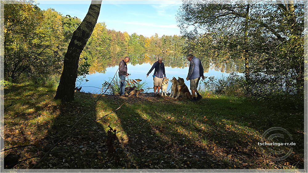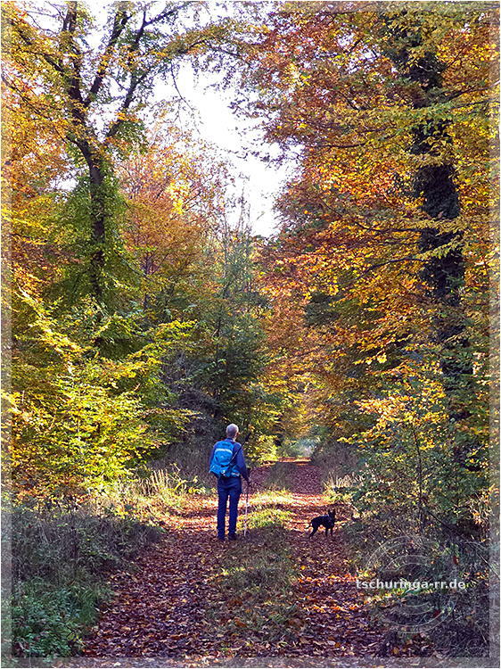 Während ich für Mittag Zimtschnecken im Omnia backe, läuft Friedbert mit den Kötis ca. vier Kilometer. Nach dem Mittagessen fahren wir zum Wattertal. Dort wandern wir über den GeoPfad "Unteres Wattertal". Bei Sonne durch herbstlichen Wald genießen wir die Wanderung sehr. Una nimmt in der Watter noch ein unfreiwilliges Bad, was sie aber nicht sonderlich stört. Auf dem Rückweg legen wir einen Einkaufsstopp beim Aldi ein, denn der liegt fast auf der Strecke. Ich hab gestern Fleisch für die Hunde vergessen. |