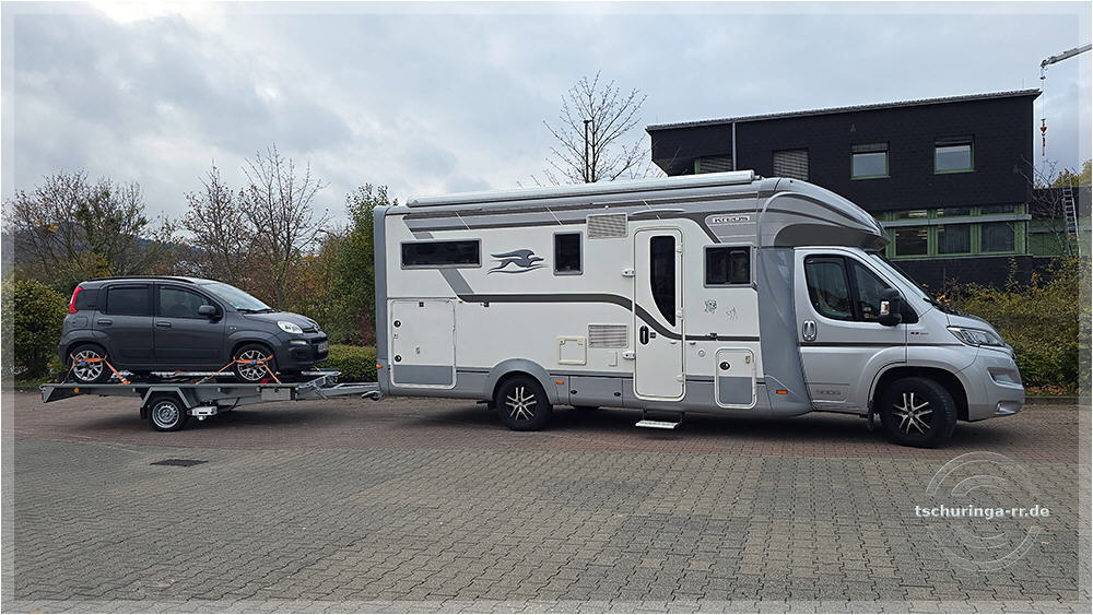 | Der Laika mit dem neuen Trailer. Der Anhänger hat jetzt einen Mover, so dass wir ihn auch mit Auto drauf rangieren können. | ||