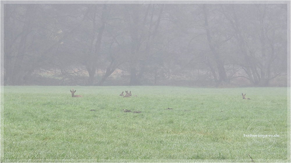 | Auf der Wiese haben es sich fünf Rehe im nassen Gras gemütlich gemacht. |