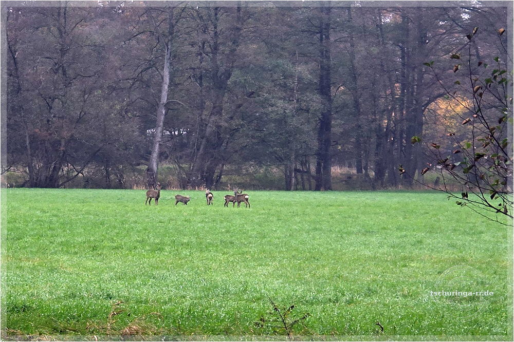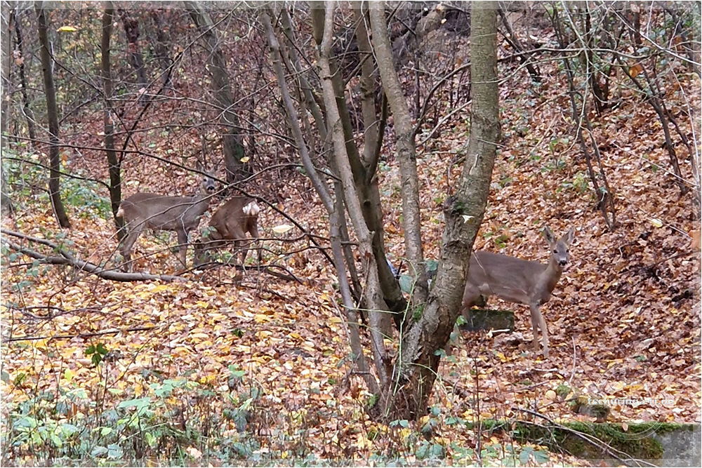 | Am Waldrand stehen drei Rehe. | ||