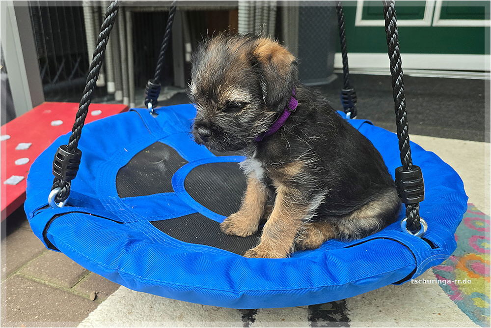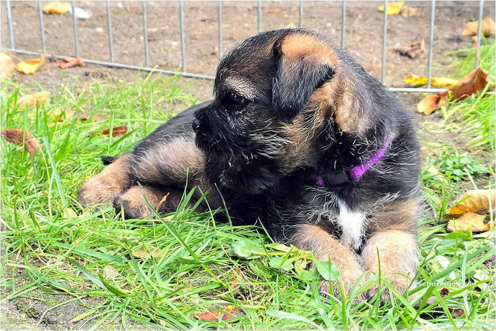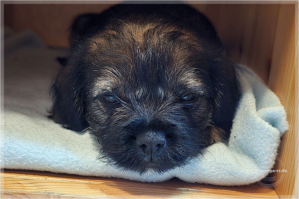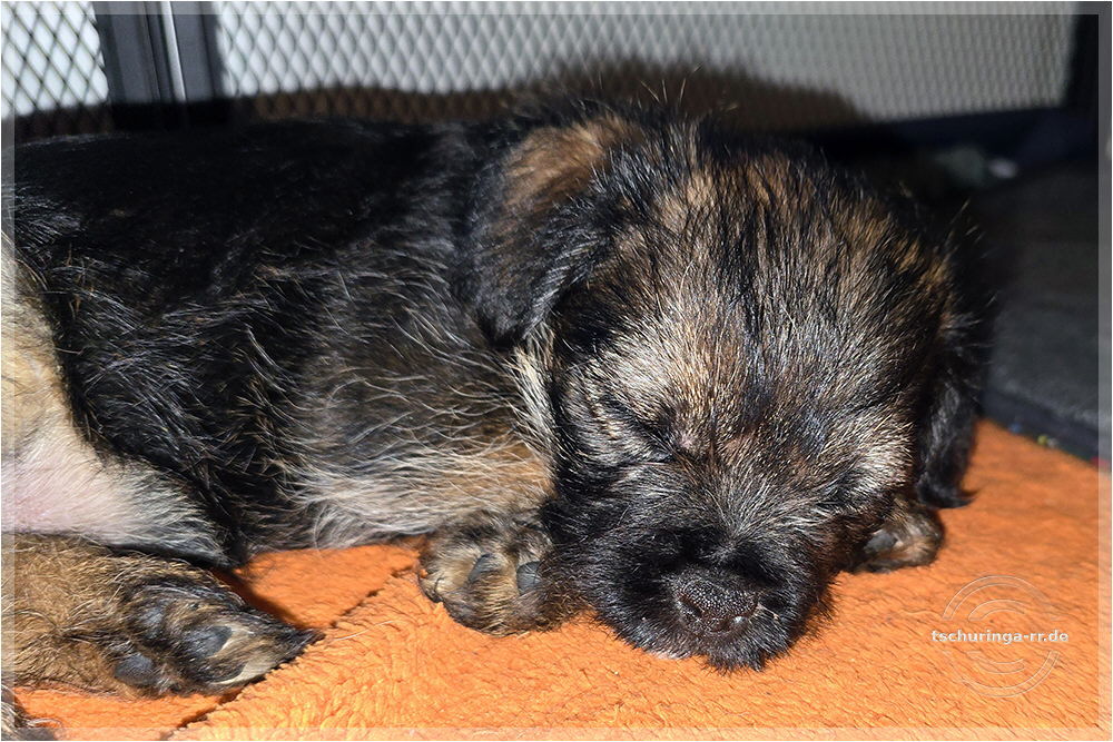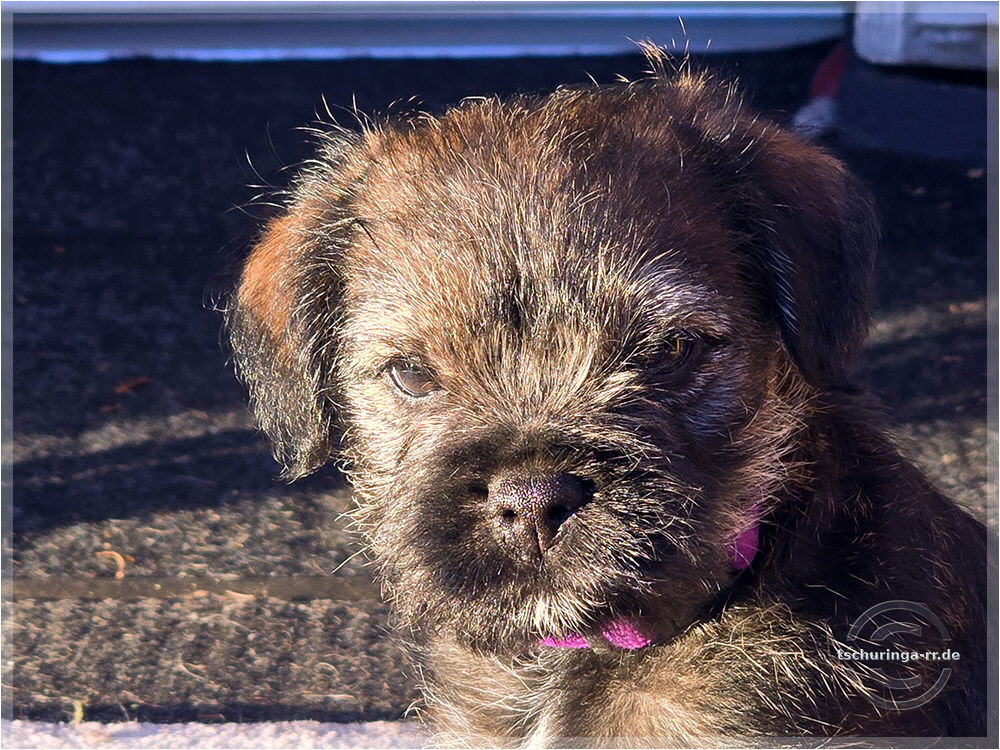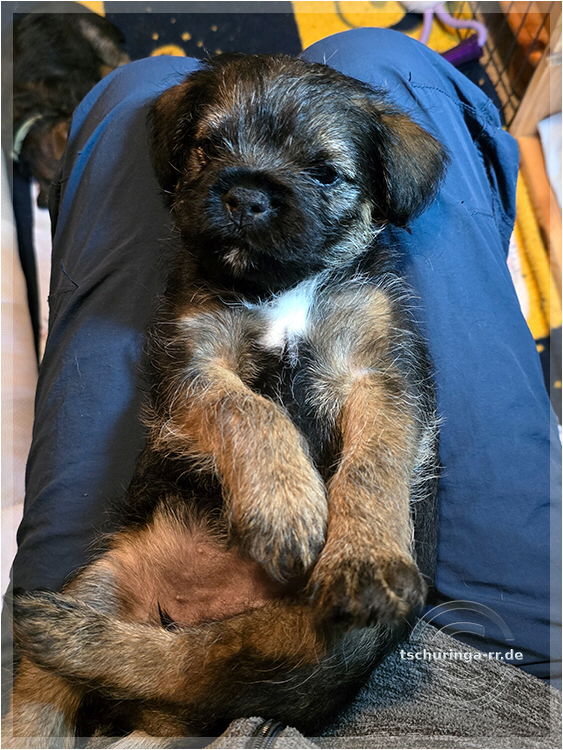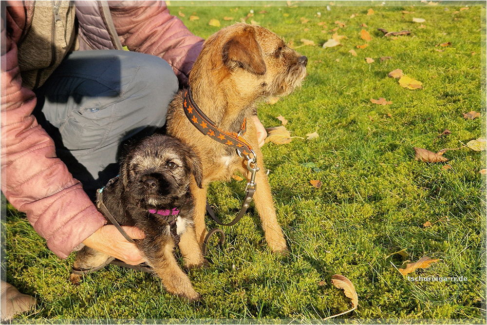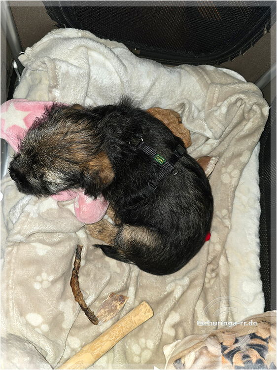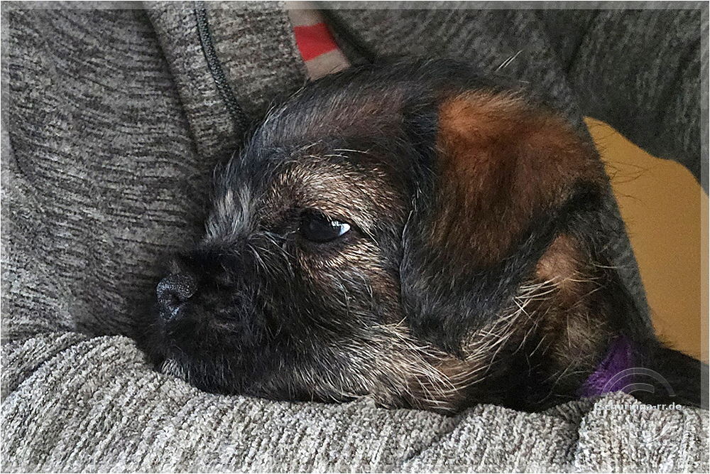 Um 6:30 Uhr hole ich Tay endgültig bei Beate ab. Um kurz nach sieben sind wir schon unterwegs. Wir kommen gut durch und mit drei Pipipausen schaffen wir es bis 15:00 Uhr nach Katzenbach. Tay hat sich super benommen. Erst auf meinem Schoß, später im Kennel und dann bei Una unten im Fußraum. Zuhause ist sie erstmal etwas unsicher, aber das legt sich schnell. Das Kleinteil ist ein recht taffes Mädel. Hier endet unsere Herbstreise rund um die beiden Würfe des Border Terrier Zwingers "Border of Dirty Devil". Ich vermute mal, dass Beate daraus auch etwas mitgenommen hat. Den Welpen ist die täglichhe rohe Mahlzeit jedenfalls gut bekommen und die zukünftigen Welpenbesitzer, die ebenfalls roh füttern möchten, haben keine Probleme mit der Umstellung. |