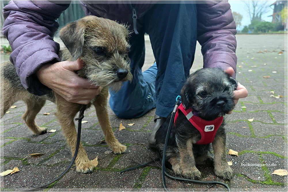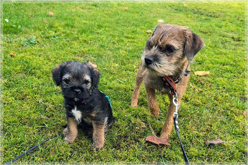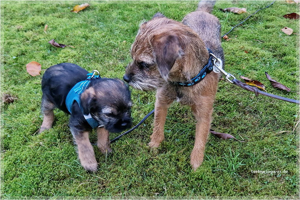 Den Morgen vertrödeln wir im Wohnmobil, weil wir auf Nachricht von Beate warten. Wenn sie Zeit hat, wollen wir eine erste Begegnung zwischen Una und Tay durchführen. Mit dem Ablauf bin ich so semi zufrieden. Una ist wahnsinnig aufgeregt und versucht Tay zu kneifen. Die quietscht erschrocken auf, ist aber nicht wirklich ängstlich. Dass es auch grantige Border gibt, muss sie erst lernen. Später kommt er mit Una rüber und wir machen einen zweiten Versuch, die beiden einander bekannt zu machen. Der verläuft erheblich besser. Das lässt hoffen. |