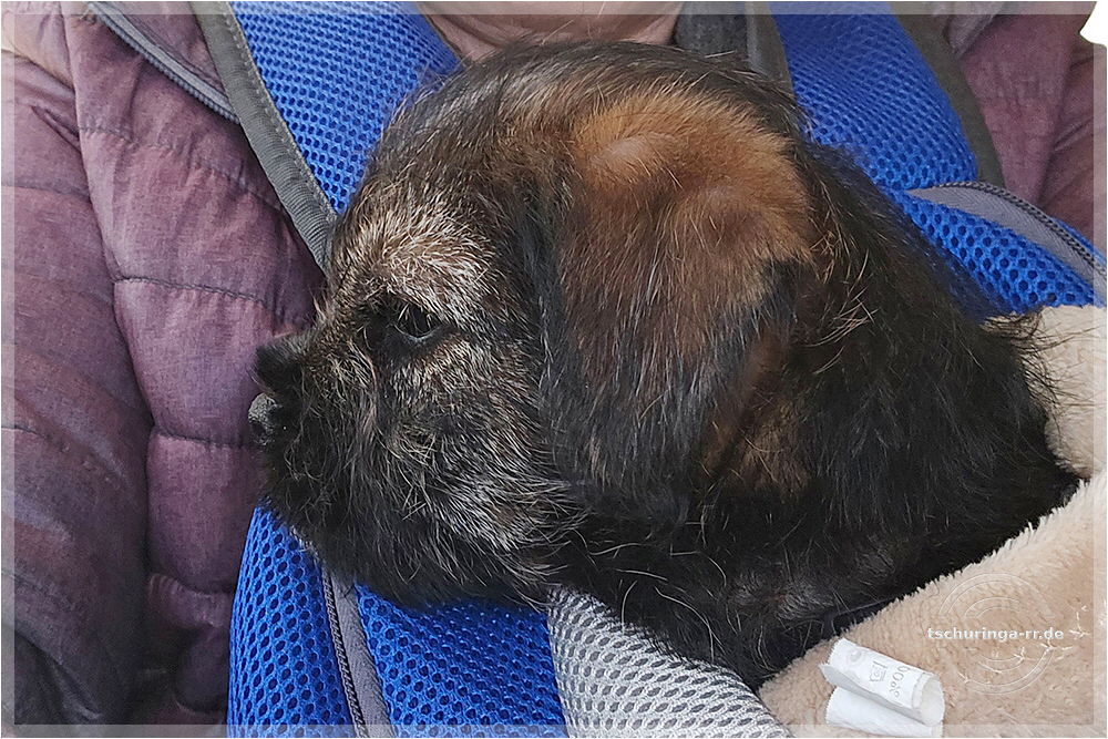 Heute zieht Tay ein. Friedbert läuft mit den beiden Großen eine gute Stunde bei richtig kaltem, aber sonnigen Wetter. So kann Tay das Wohnmobil erst mal in Ruhe erkunden. Die Zusammenführung klappt problemlos dank der guten Vorbereitung. Una ist völlig aus dem Häuschen, dass die Lütte endlich da ist. Am Nachmittag machen wir einen gemeinsamen Spaziergang, auf dem Tay auch schon ein gutes Stück läuft. Die restliche Strecke ist sie warm eingepackt im Rucksack. |