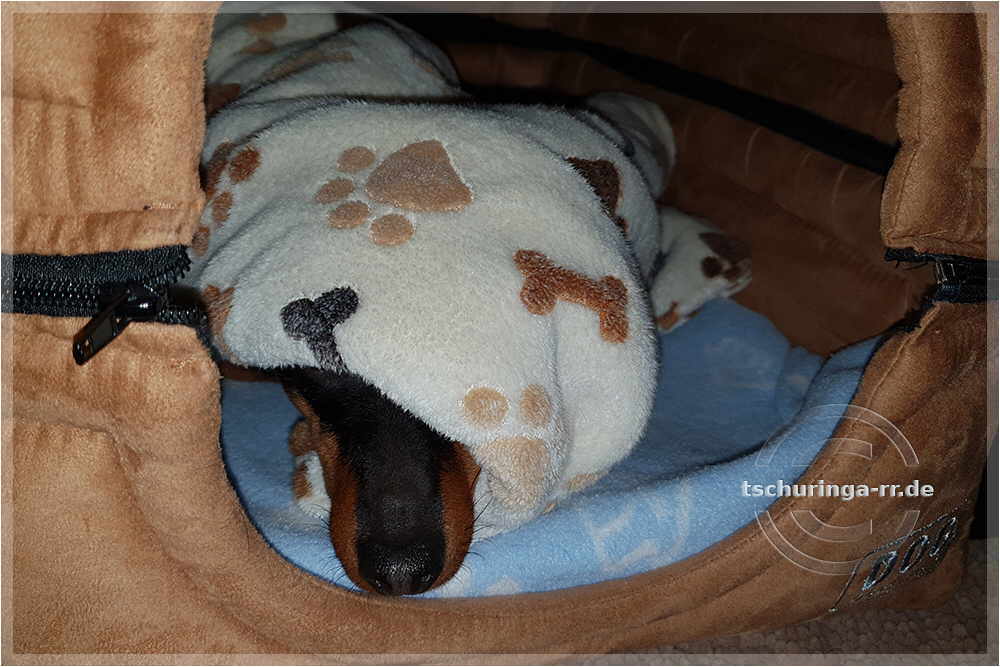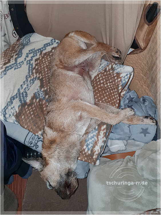 | Interessanterweise sind beide Hunde während des eigentlichen Radaus um Mitternacht völlig entspannt und schlafen. | ||