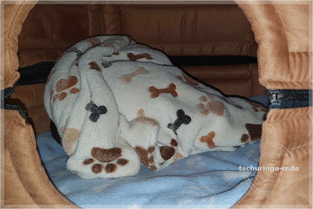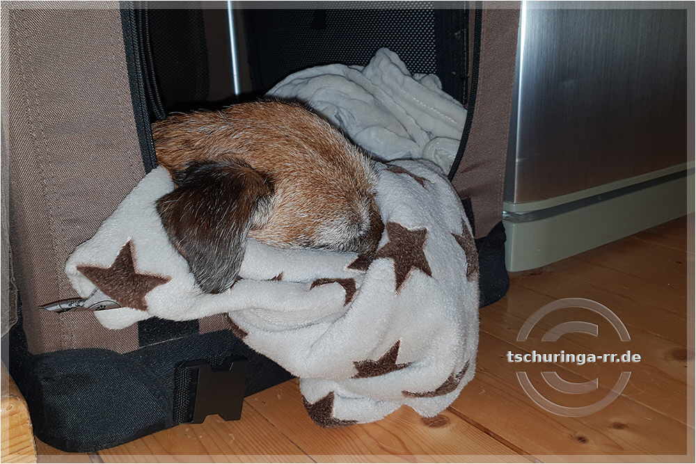 | Lennox in seiner Schlafbox. Nase guckt noch raus, man könnte ja was verpassen. | ||