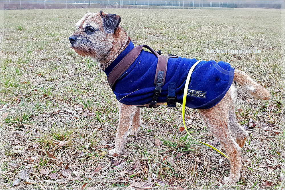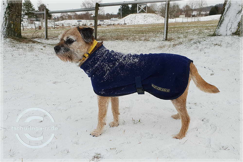 | Yukon schmollt, weil er Mantel und Geschirr tragen muss. | ||