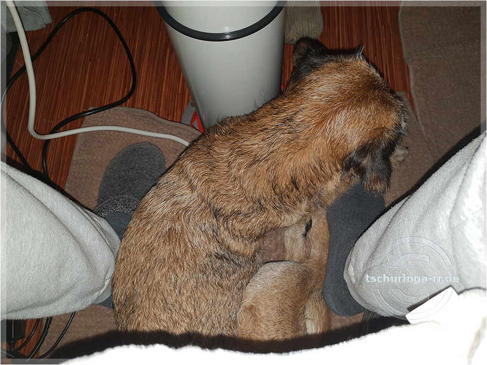 | Yukon ist ziemlich genervt und verkriecht sich unter den Tisch zwischen meine Füße. | ||