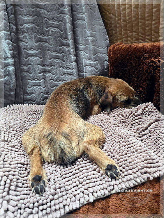 Er läuft inzwischen wieder recht gut mit. Schuhe braucht er aber noch, weil er sich sonst die Pfoten aufscheuert, denn er schleift noch ordentlich damit über den Boden. |