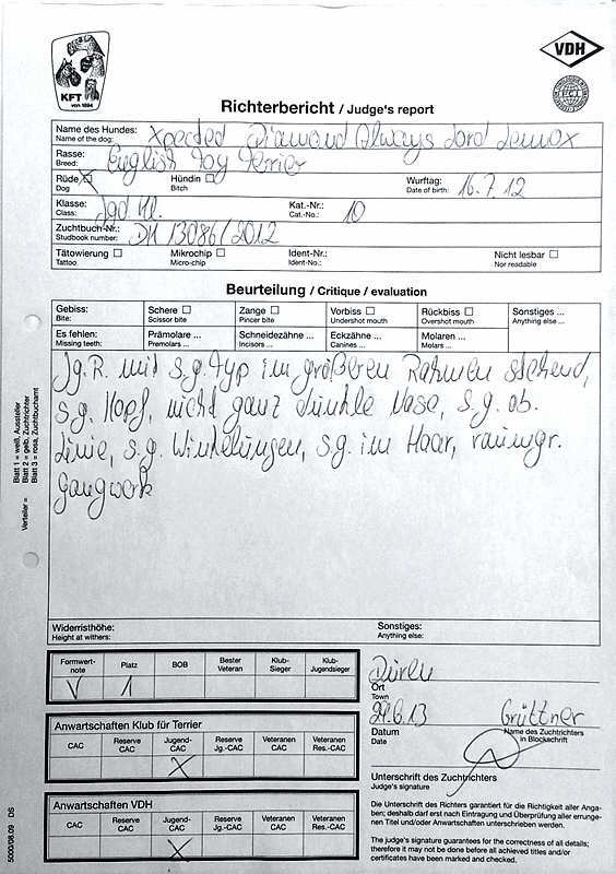 Junger Rüde mit sehr gutem Typ, in größerem Rahmen stehend, sehr guter Kopf, nicht ganz dunkle Nase, sehr gute obere Linie, sehr gute Winkelungen, sehr gut im Haar, raumgreifendes Gangwerk