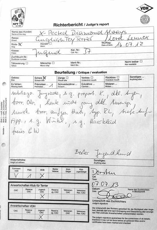 substanzvoller Jungrüde, sehr gut proportionierter Kopf, dunkle Augen, korrektes Ohr, heute nicht ganz dunkler Nasenspiegel. musukulöser korrekt aufgesetzer Hals, typische Rückenlinie, tiefe Aufrippung, sehr gute Winkelungen, sehr gutes Haarkleid, freies Gangwerk |