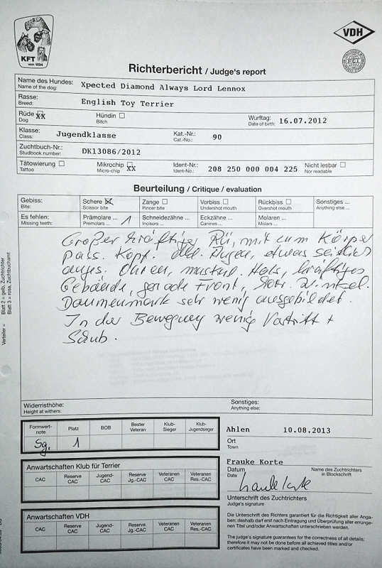 Übersetzung Großer, kräftiger Rüde mit zum Körper passendem Kopf, dunkle Augen, etwas seitlich angesetzte Ohren, muskulöser Hals, kräftiges Gebäude, gerade Front, korrekte Winkel, Daumenmarker sehr wenig ausgeprägt, in der Bewegung wenig Vortritt und Schub |