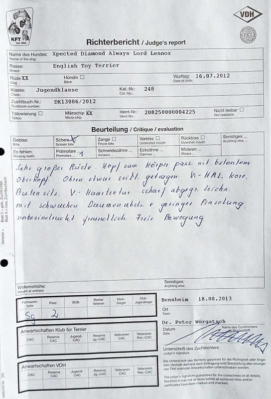 Sehr großer Rüde, Kopf zum Körper passend mit betontem Oberkopf, Ohren etwas seitlich getragen, vorzügliche Hals-Rücken-Linie, korrekter Rutensitz, Vorzügliche Haartextur, scharf abgegrenzte Zeichnung mit schwachen Daumenabdrücken und geringer Pinselung, unbeeindruckt freundlich, freie Bewegung |