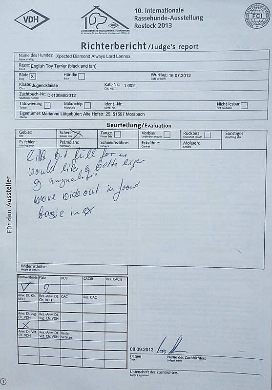 Übersetzung little bit full for me - etwas zu kräftig für mich would like a better expression - würde mir etwas mehr Ausdruck wünschen good angulation - gute Winkelungen move wide out in front - weit ausgreifende Bewegung vorne basic in expression - rassetypischer Ausdruck