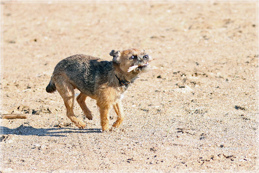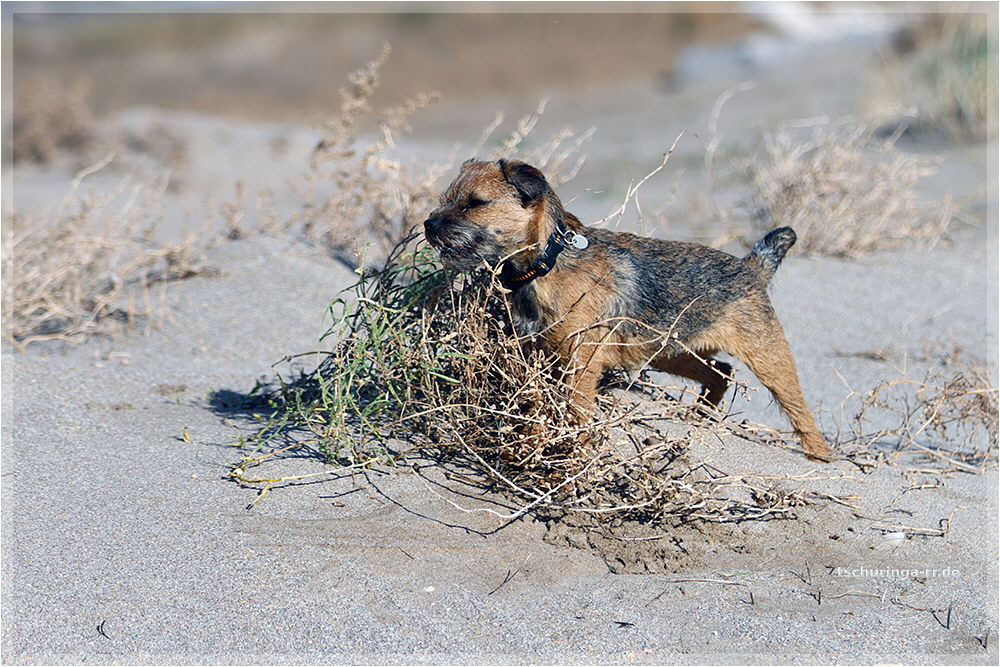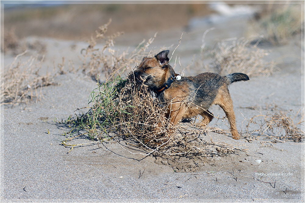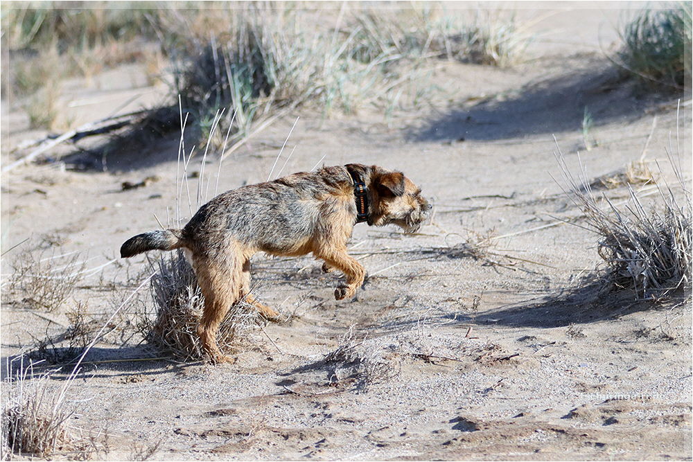 Leider ist es ein recht kurzes Vergnügen, denn der Wind kommt vom Land und treibt den trockenen Sand so heftig vor sich her, dass es für die Hunde so unangenehm ist, dass wir abbrechen.
