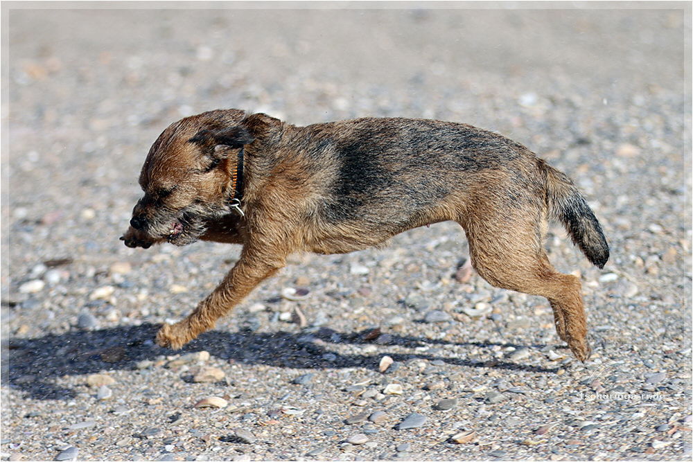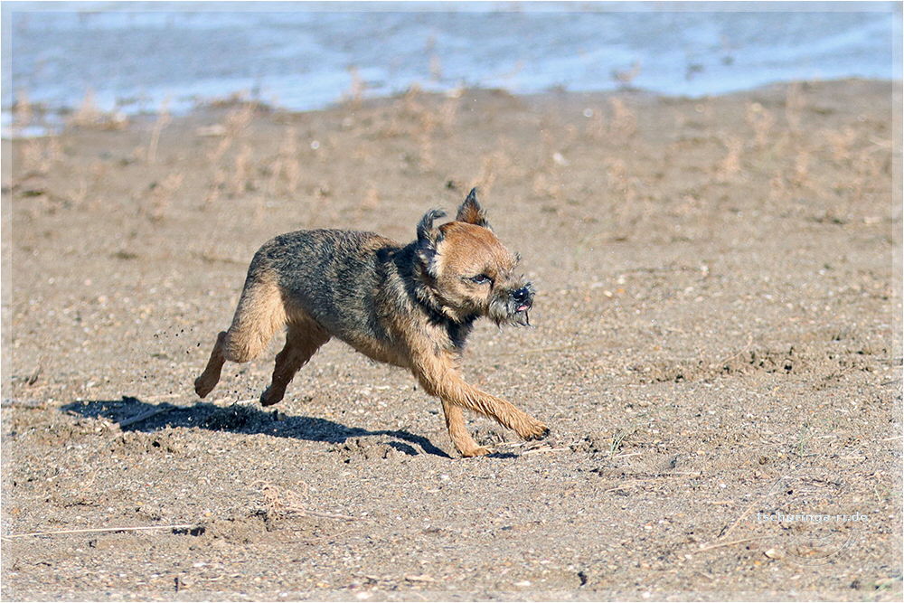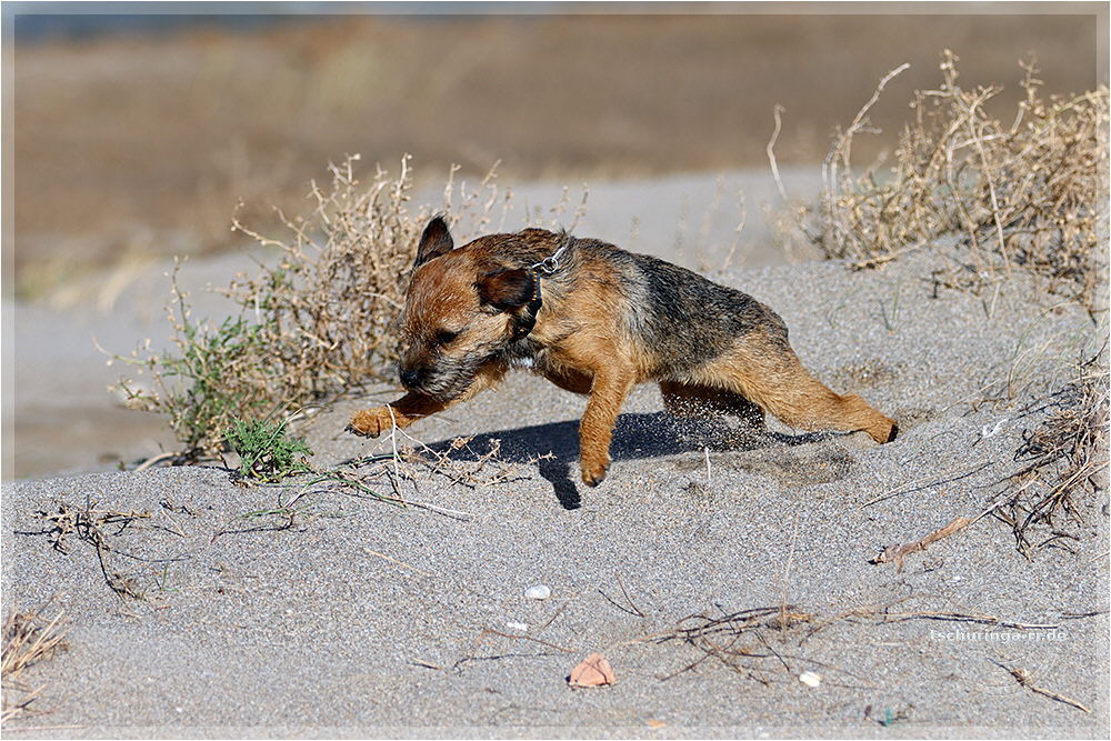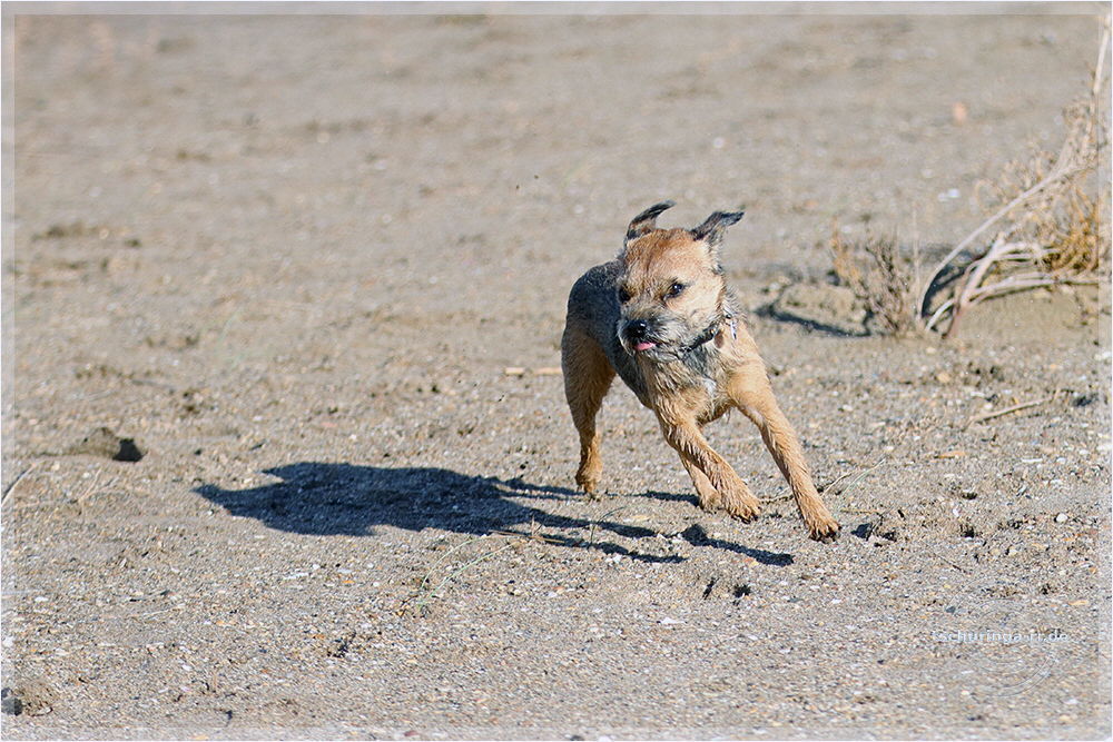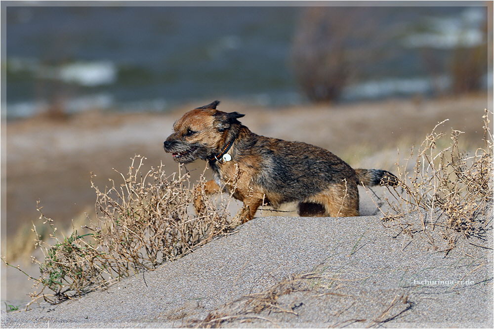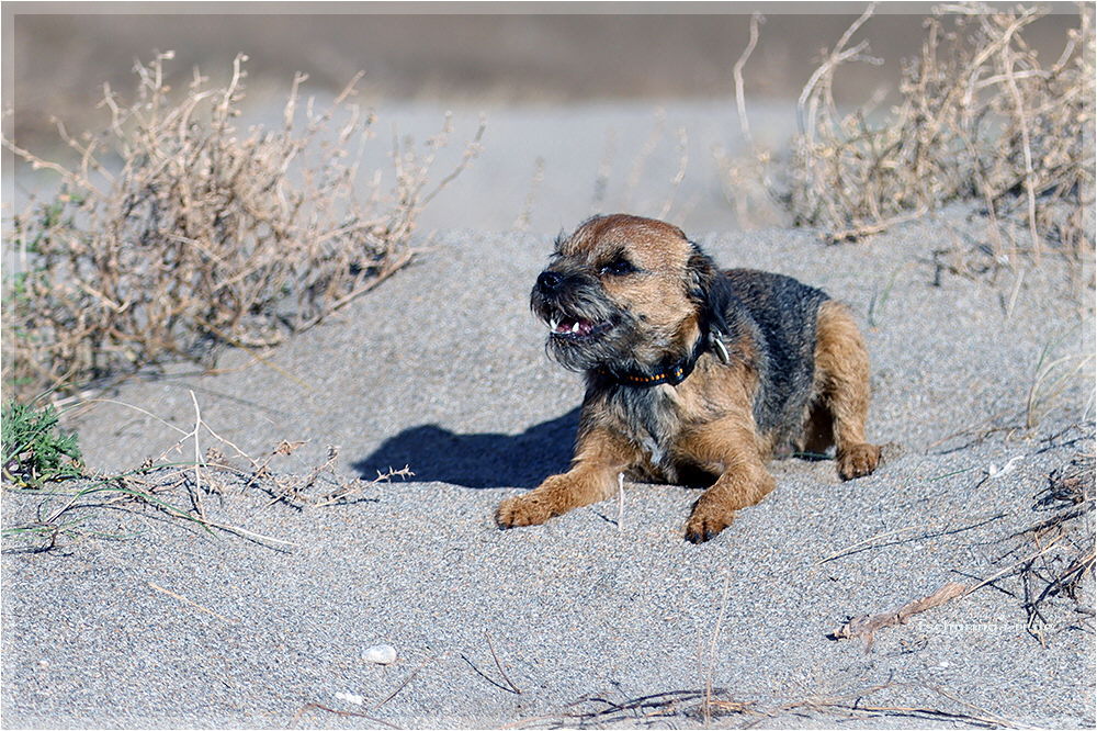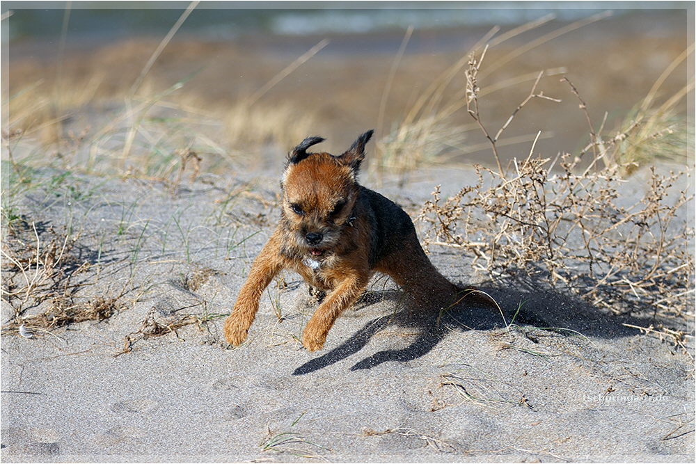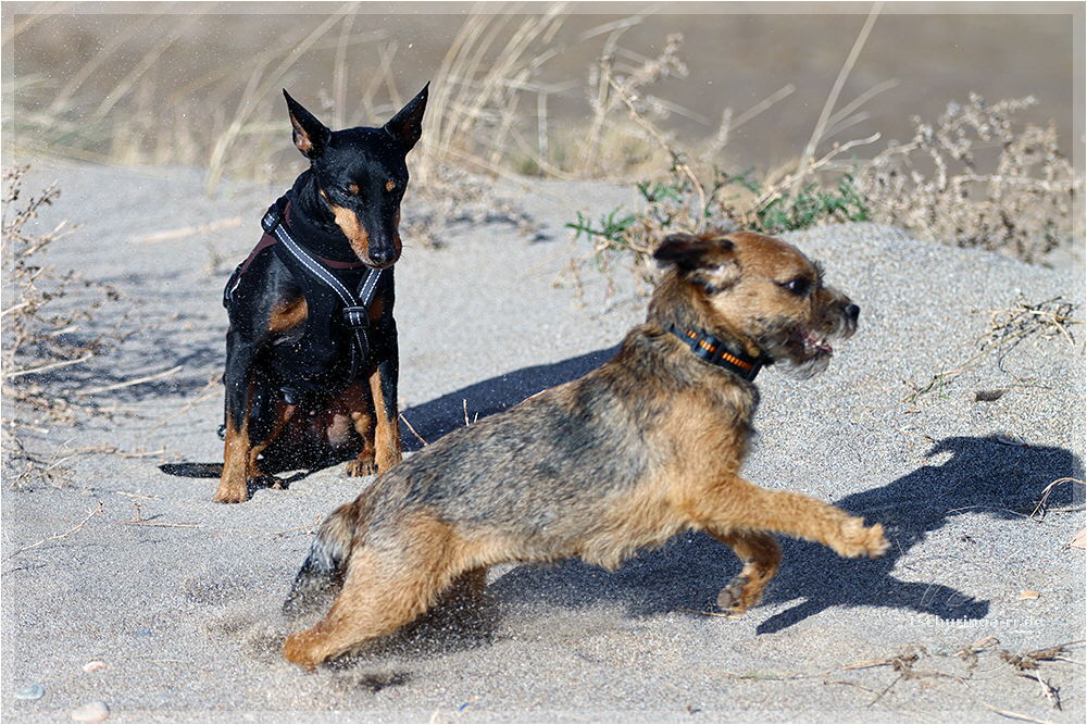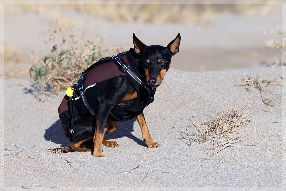 So sieht ein Englisch Toy Terrier aus, wenn er von Wind und Sand angegriffen wird und dann auch noch "Una Brummkreisel" ständig um ihn rum tobt.