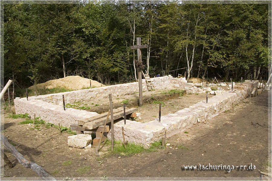 | Zum Vergleich: Der Bau im September 2014 Im Mittelalter gab es übrigens keine Steinmauern. Die Kirche wäre ausschließlich aus Holz gewesen. |