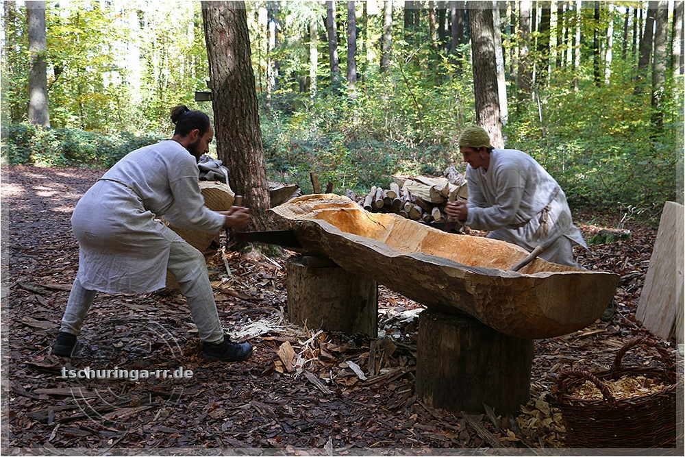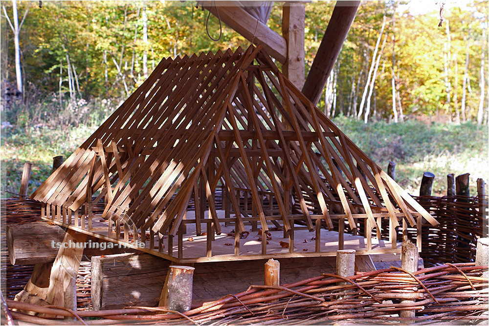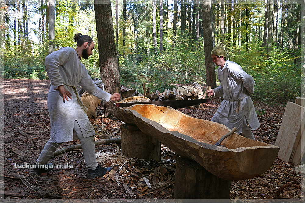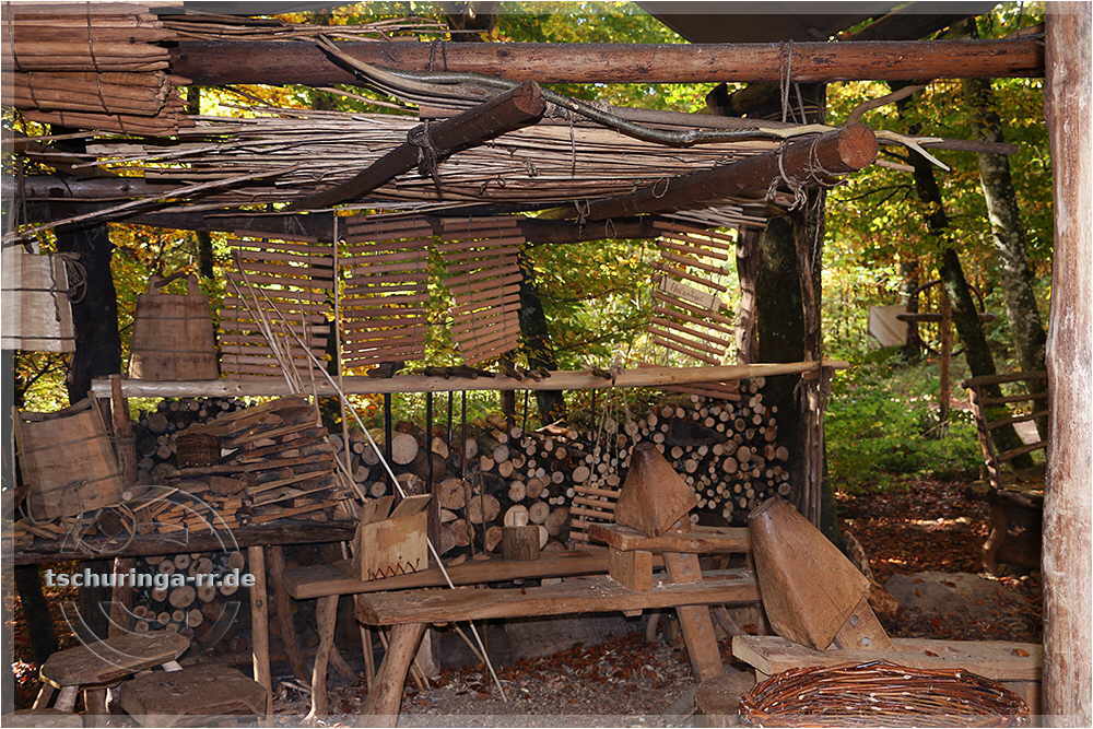 | Der Abbundplatz. Hier werden aus Baumstämmen mit Äxten Balken geschlagen. |