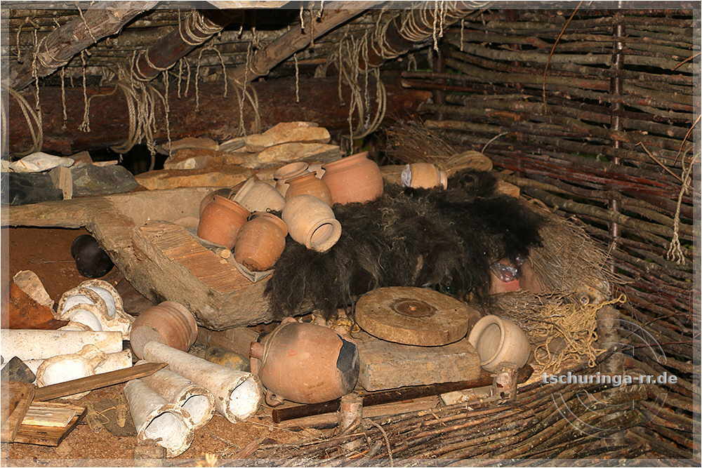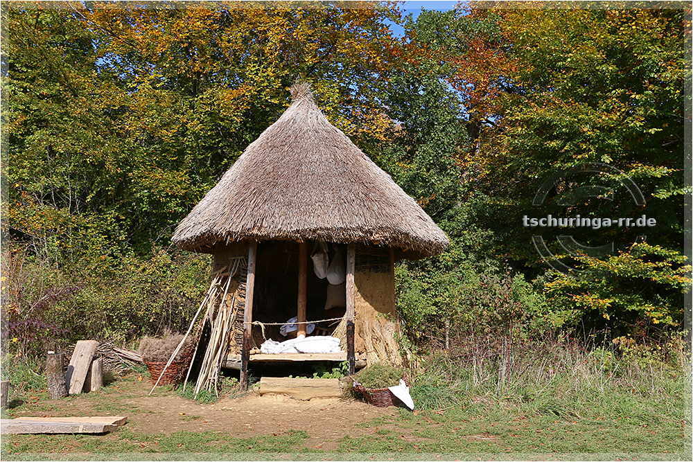 | Kleiner Sechs-Pfosten-Speicher, in dem Ernte und Saatgut gelagert wird. |
