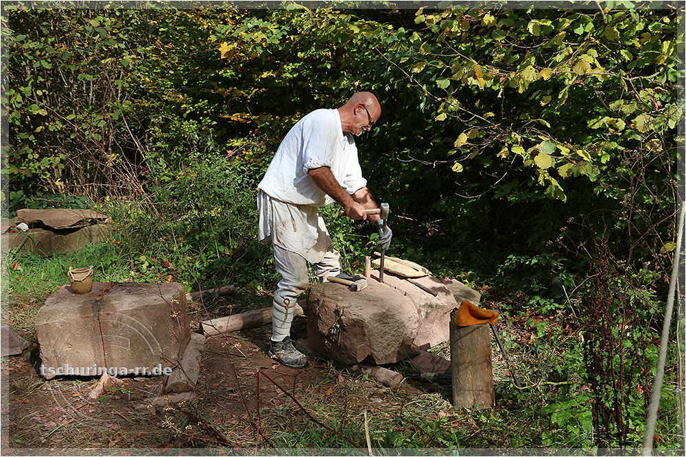 | Hier spaltet er einen Stein. |