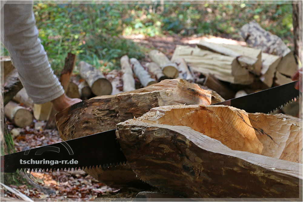 | aber je weiter die Säge in den Stamm geht, desto schwerer wird das Sägen. |