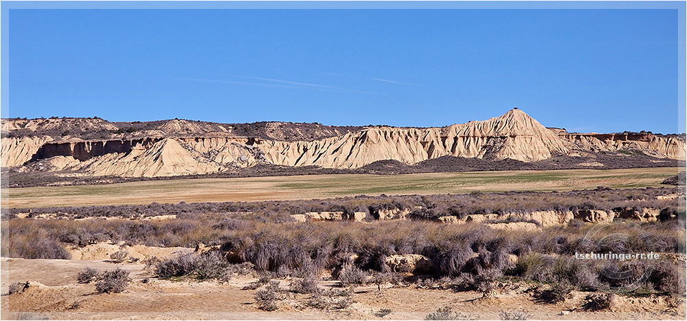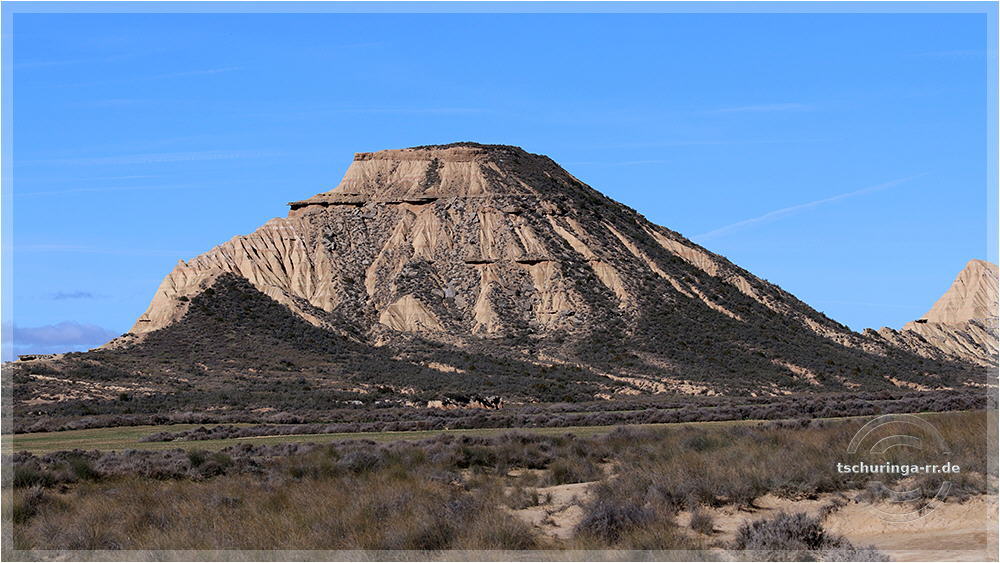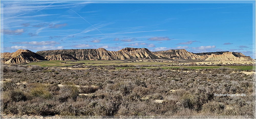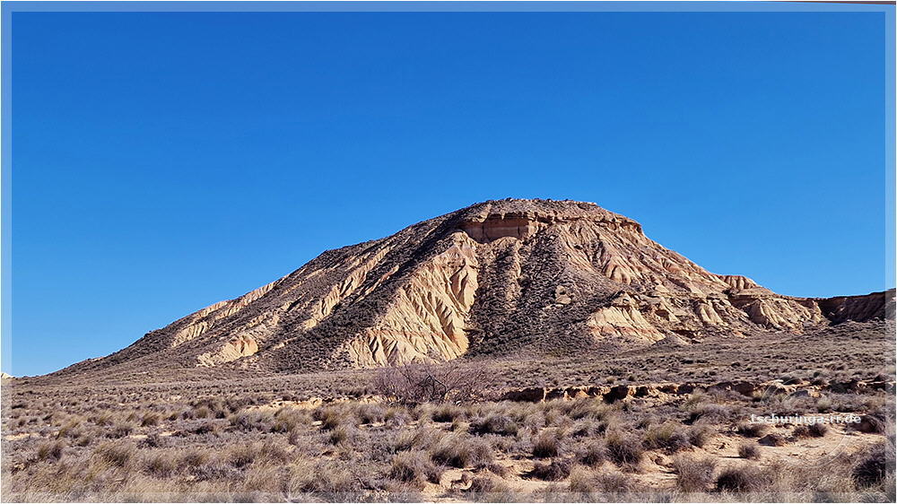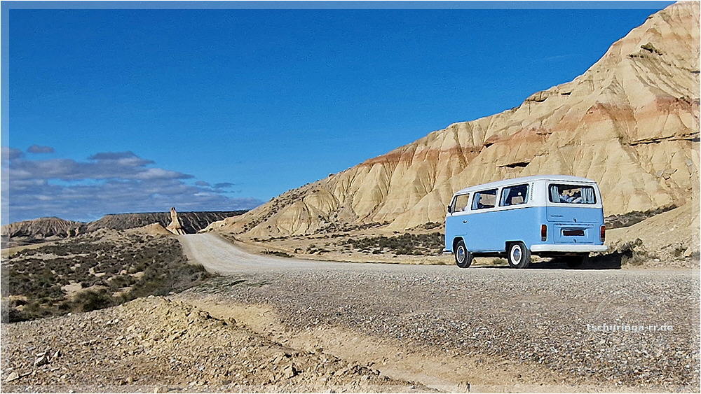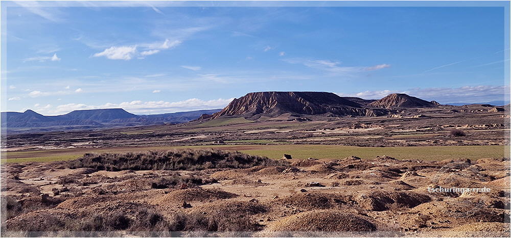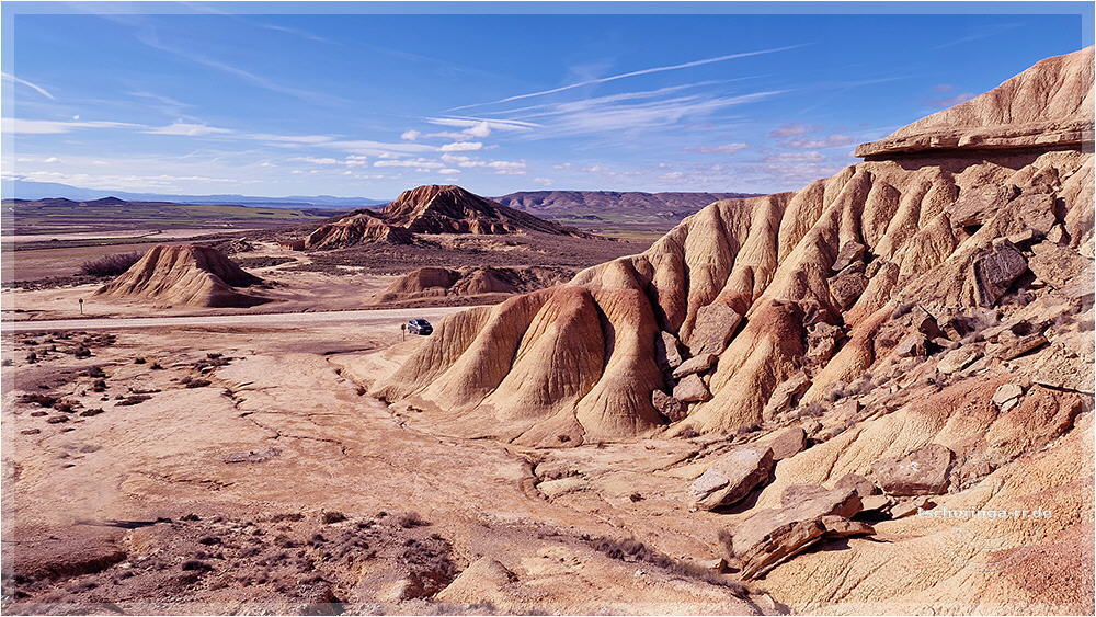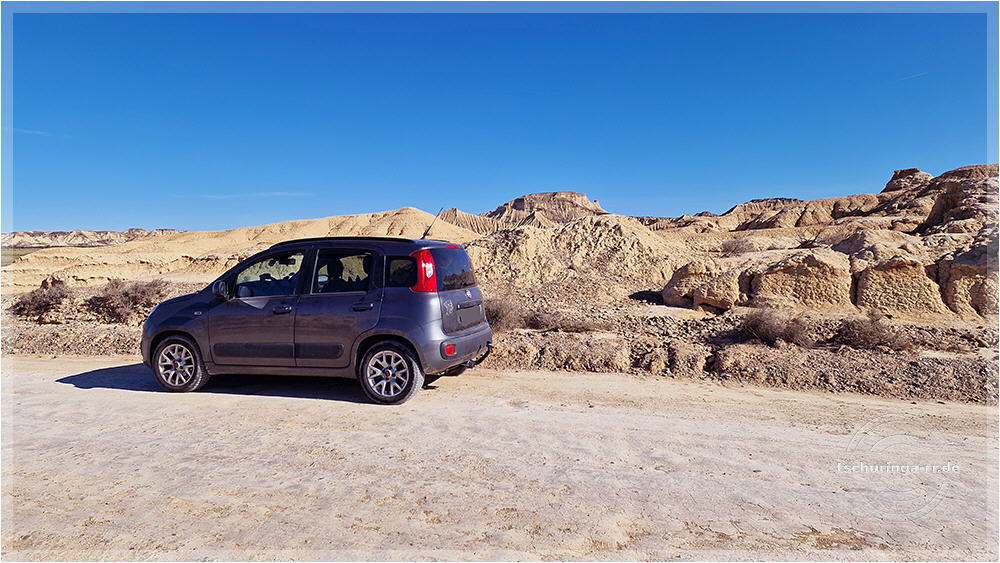 Mit dem Panda fahren wir gut 10 Kilometer durch die Halbwüste der Navarra, den Bardenas Reales. Das Gebiet umfasst insgesamt eine Fläche von 415 km².