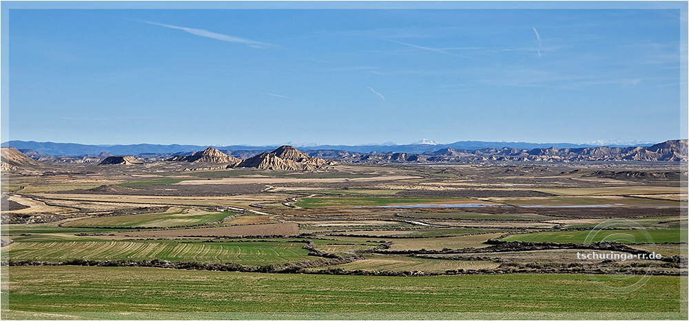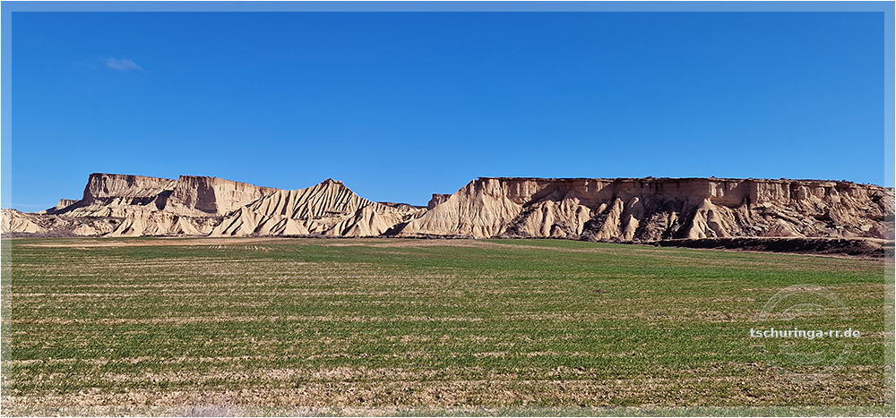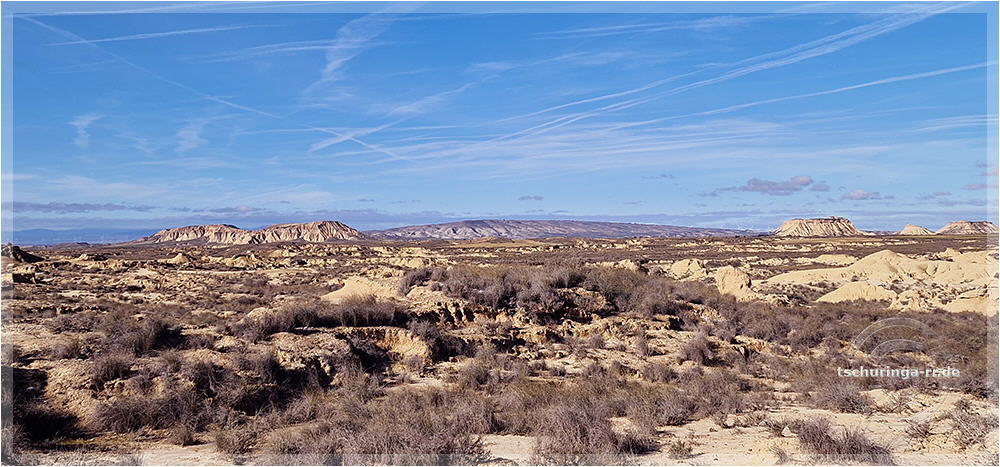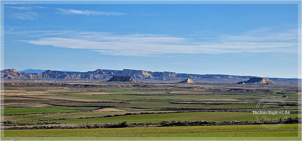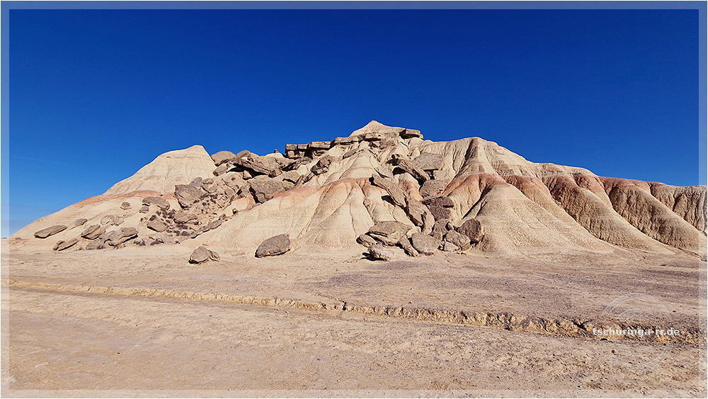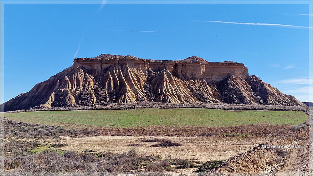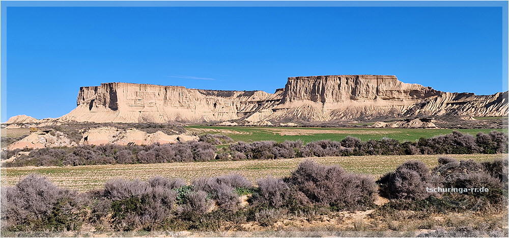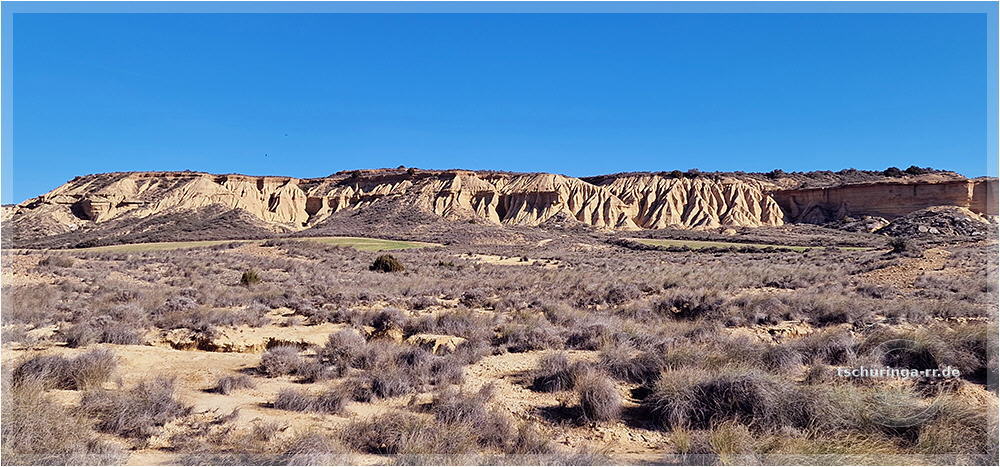 Mit dem Panda fahren wir gut 10 Kilometer durch die Halbwüste der Navarra, den Bardenas Reales. Das Gebiet umfasst insgesamt eine Fläche von 415 km².