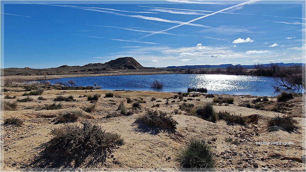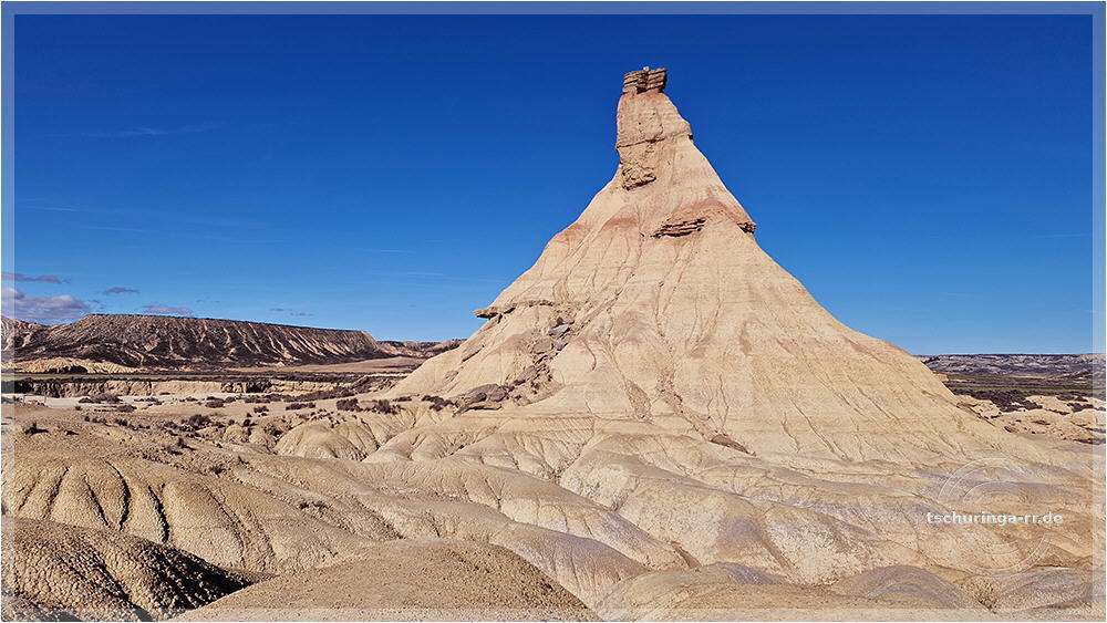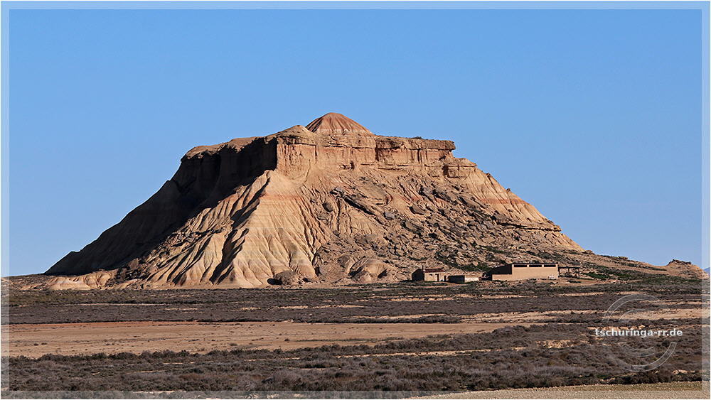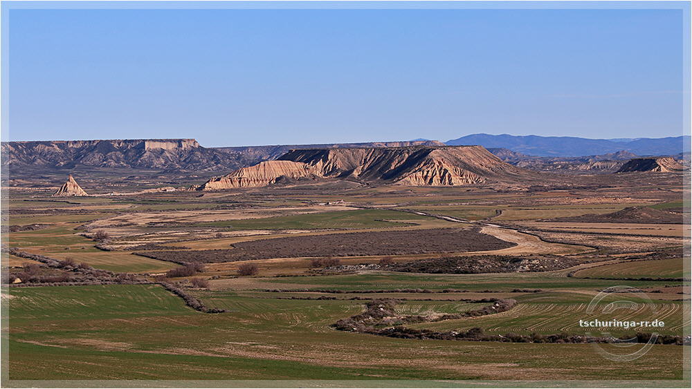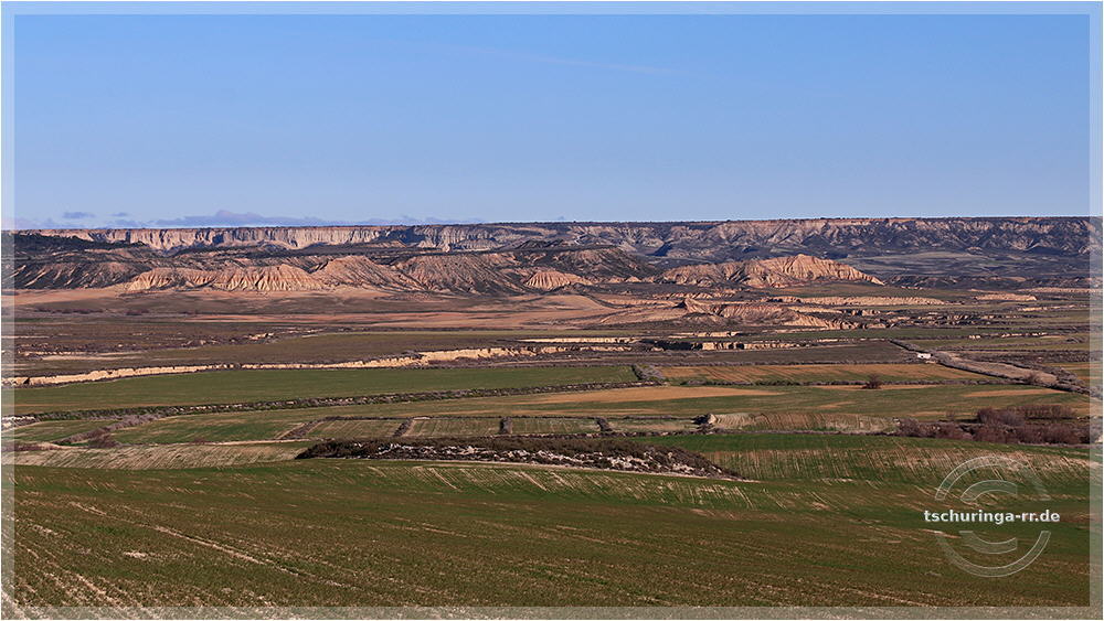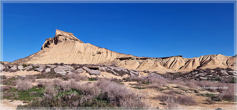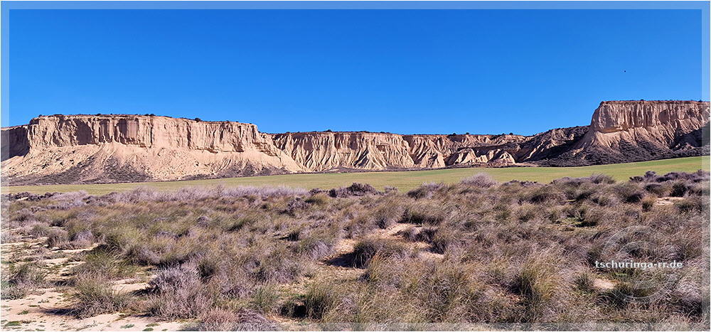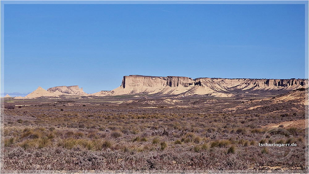 Mit dem Panda fahren wir gut 10 Kilometer durch die Halbwüste der Navarra, den Bardenas Reales. Das Gebiet umfasst insgesamt eine Fläche von 415 km².