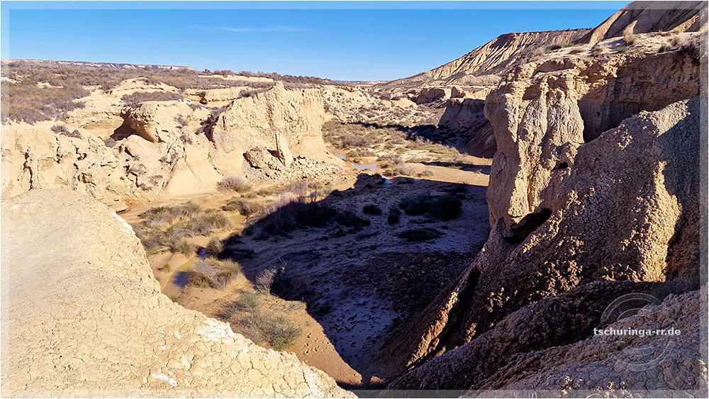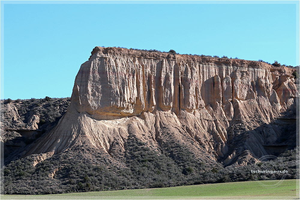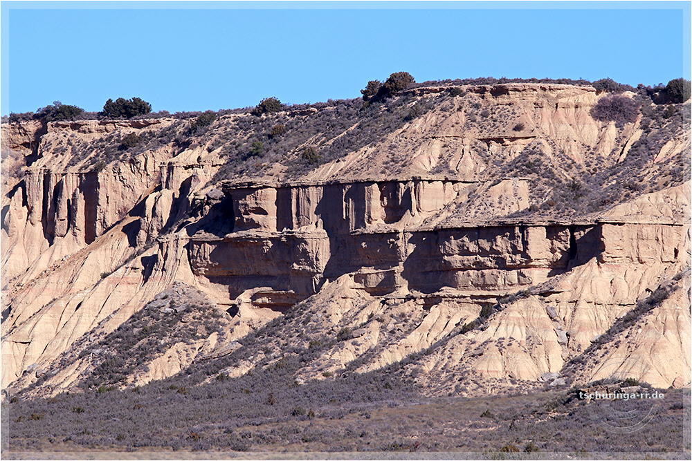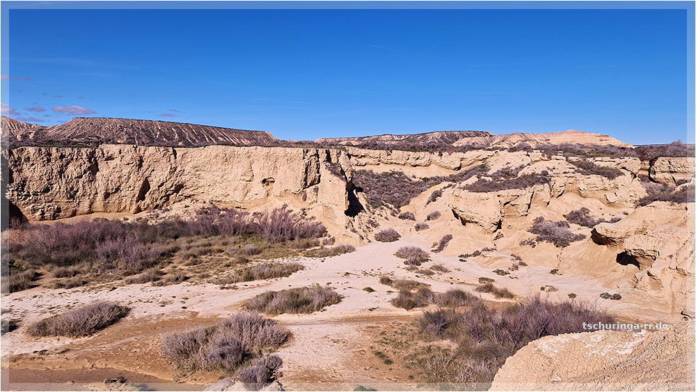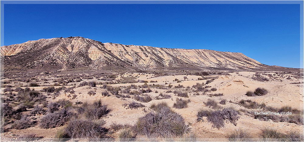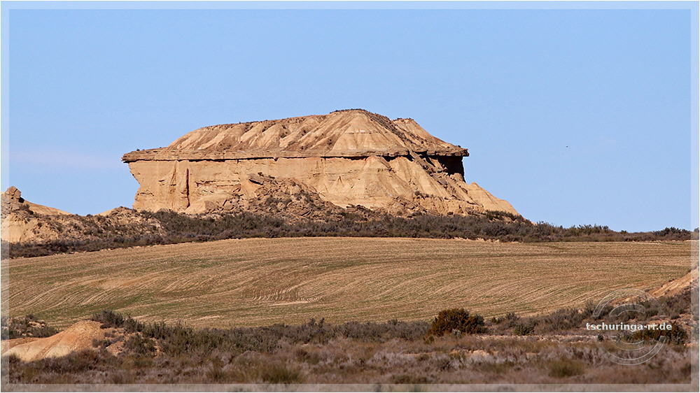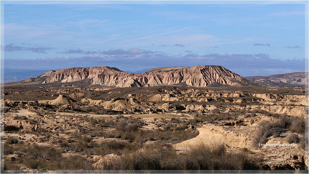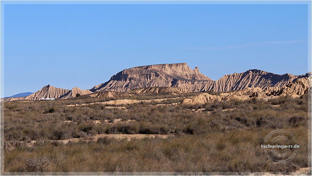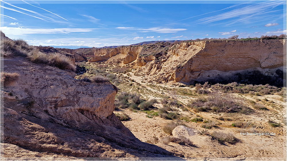 Beeindruckend ist die bizarre Landschaft, die zum größten Teil aus ockerfarbenem Lehm besteht. Typisch sind auch die Barrancos, die ausgetrockneten Flussbetten, sowie die Bergformen wie der Castil de Tierra. |