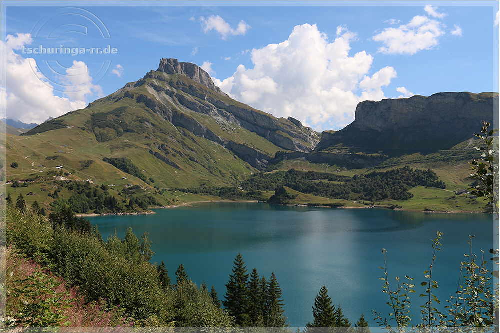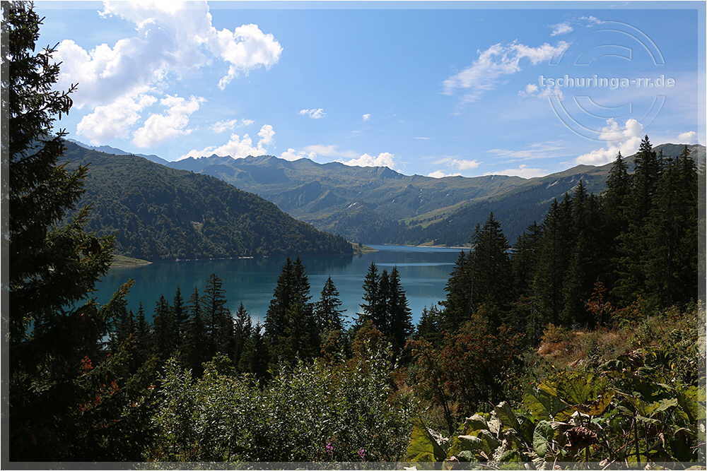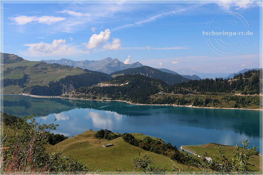 | Blick auf die Talsperre am "Col de Méraillet" und die umliegenden Berge | ||