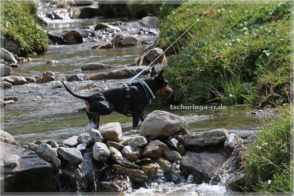 | Lennox an der Leine. Würde sich im Tal was bewegen, gäbe er Vollgas. Man kann gut sehen wie angespannt er ist. | ||