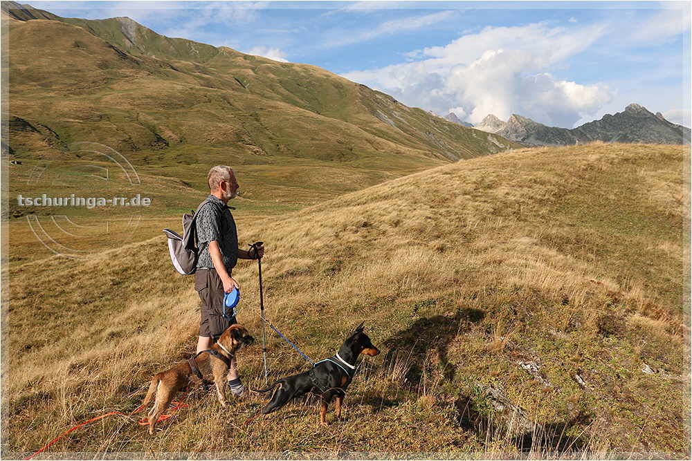 | Die Jungs sind auf dem Rückweg angeleint, weil wir auf der Weide einer Rinderherde unterwegs sind. | ||