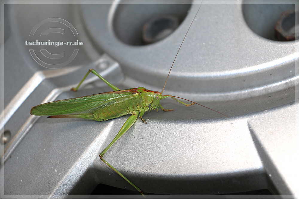 | Dieses Heupferd hat sich an einer Zierblende gesonnt. Vor Abfahrt wird es gerettet. | ||