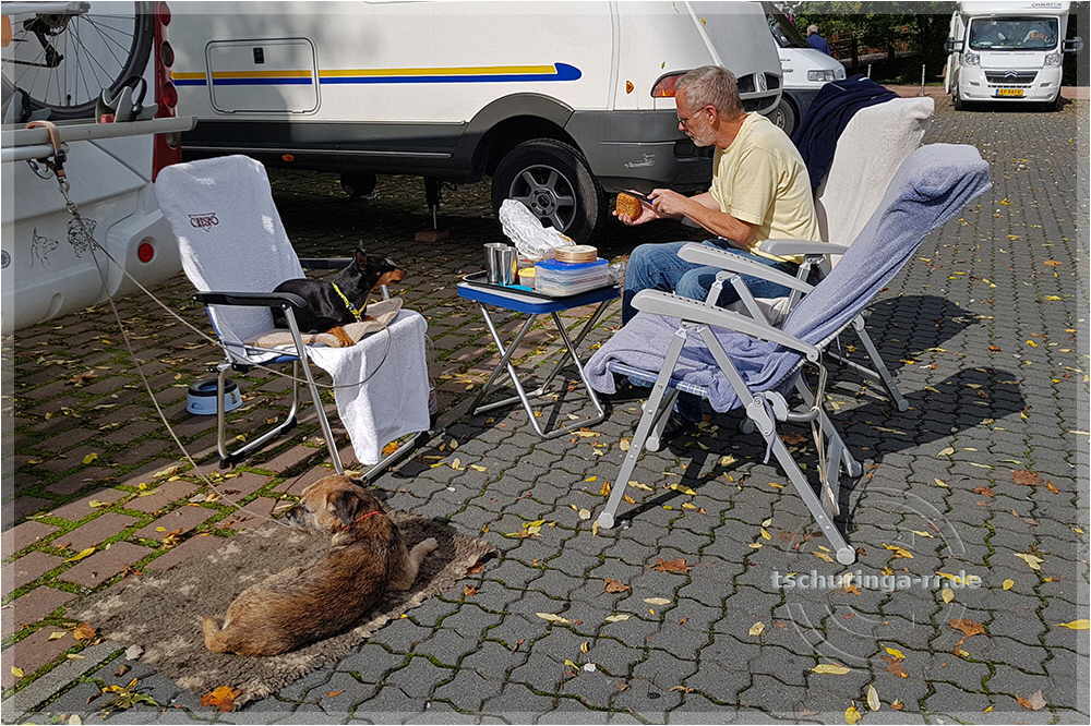 Dienstag, 03.10.2017 Nach dem Frühstück machen wir eine ausgiebige Wanderung. Diesmal am anderen Ufer mainabwärts. Das Wetter spielt mit, so dass wir nach der Rückkehr in der Sonne unsere Mittagsbrötchen essen. Später laufen wir noch eine Weile mit den Hunden am Main entlang. |