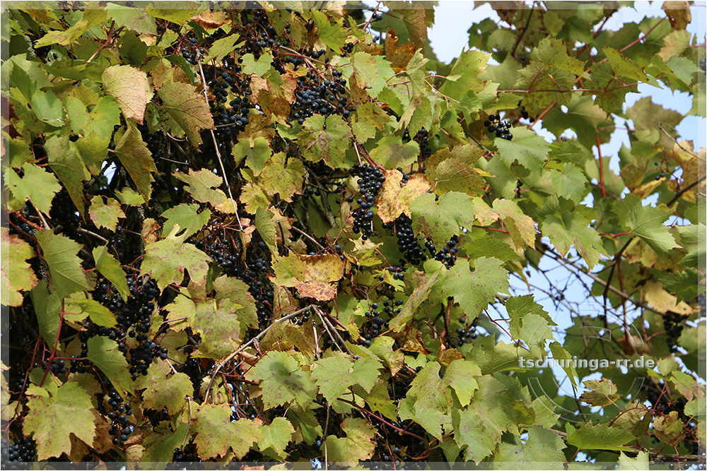 | Der Wein rankt wild in den Obstbäumen. | ||