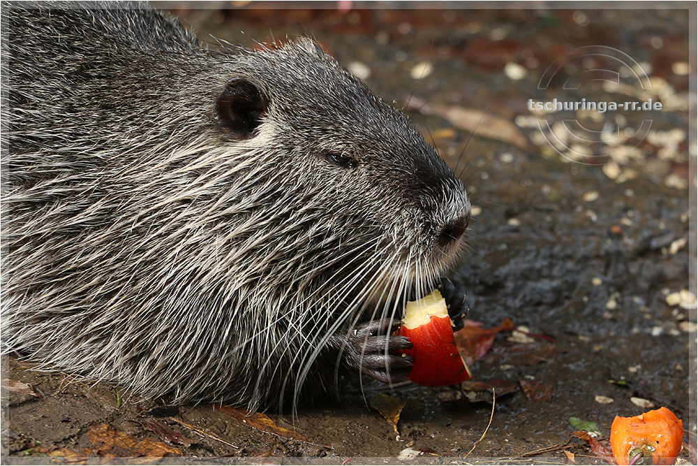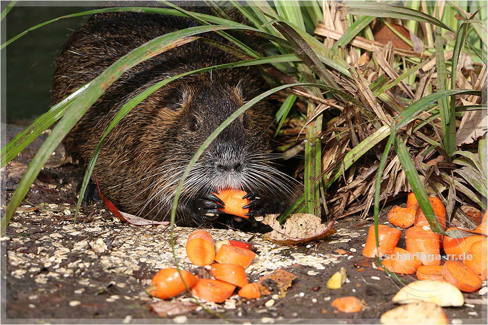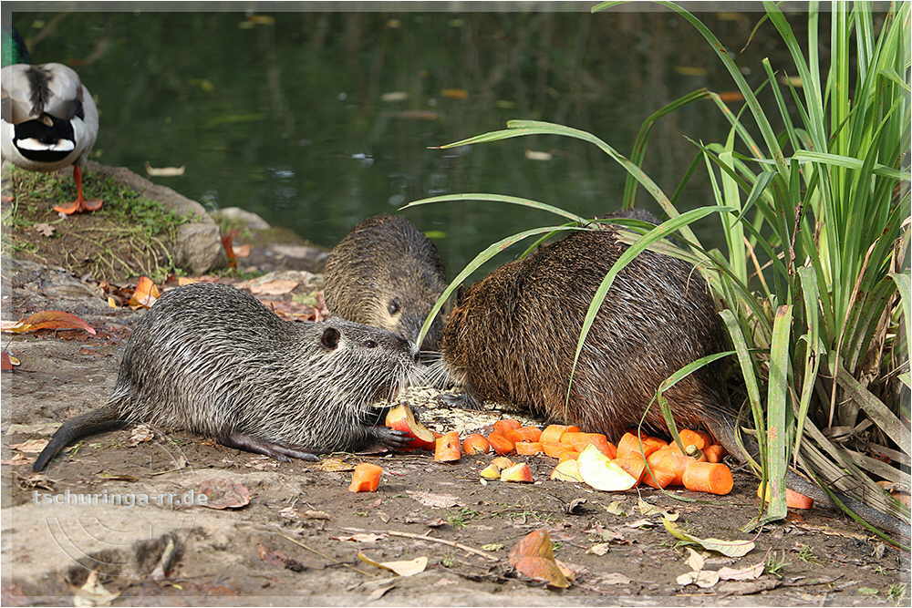 | Im Park gibt es einen kleinen Teich, an dem sich verwilderte Nutrias angesiedelt haben, die hier (verbotenerweise) gefüttert werden. | ||