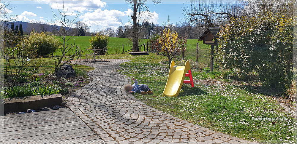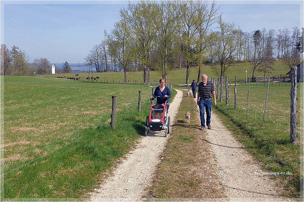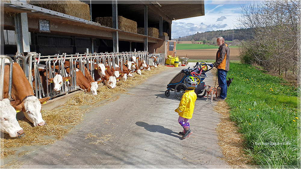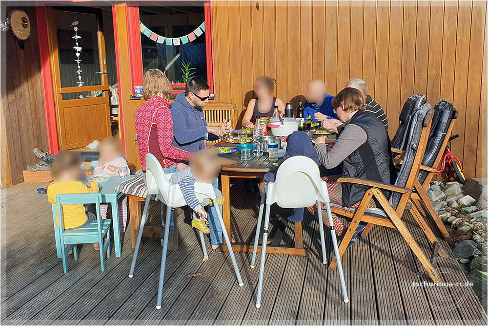 Der Kindergarten hat heute noch geschlossen. Daher müssen die Kinder heute Morgen noch mal betreut werden. Friedbert, Alexandra und René fahren mit den vier Kids zum Streichelzoo und Spielplatz in die Lochmühle. Ich bleibe "zu Hause", denn im Streichelzoo ist alles geteert, was für Yukons Pfoten Gift ist. Außerdem ist schon klar, dass das Ganze recht lange dauern wird. Die Großen wollen Tiere gucken und über den Spielplatz toben. Die Kleinen müssen schlafen, zumindest eine Zeit lang. Also bastel ich an der Homepage und lüfte zwischendurch mal die Hunde. Nach Mittag fahren Friedbert und ich mit den Jungs noch mal ins Bärlauchtal und laufen diesmal bis oben hin. Nach einem ausgiebigen Blick auf die Alpen geht es wieder runter. Abendessen gibt es heute in geselliger Runde auf der Terasse, die um diese Zeit noch richtig von der Sonne erwärmt wird. |