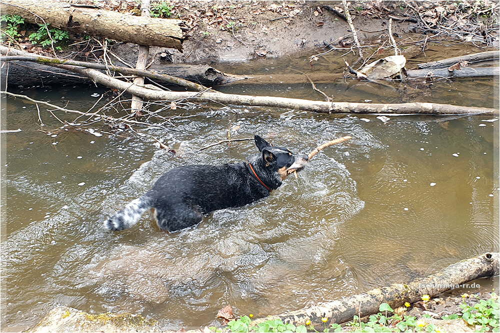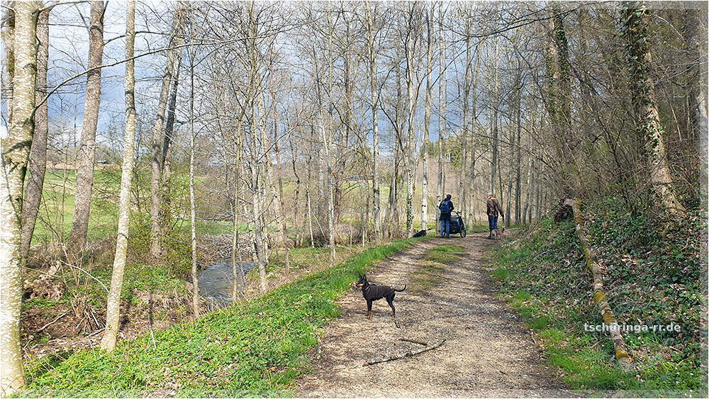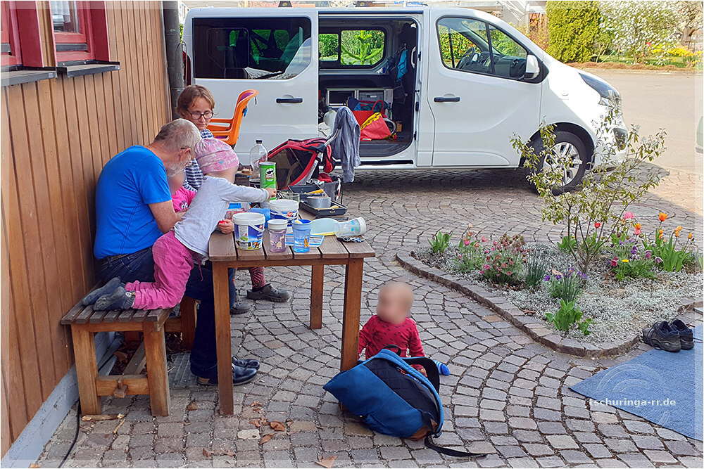 Heute geht es mit der ganzen Truppe ins Krebsbachtal und wir wandern einen Teil des Premiumwanderwegs "Krebsbachputzer". Da Patricia und Familie morgen Abend in den Urlaub an die Ardeché starten und am Sonntagmorgen auch Alexandra und Familie zurück ins Oberbergische Land fahren, werden eben heute schon Ostereier gesucht. Rieke und Ruth haben ihren Spaß. Opa Friedbert auch, denn der geht mit Yukon vorne weg und versteckt die Eier so, dass sie auch von den Kindern gefunden werden können. Ruben und Karl verschlafen die Suche in den Kinderwagen. Nach einer Weile wird die Kinderwagenbesatzung gewechselt, denn gut sechs Kilometer sind für Rieke und Ruth noch zu weit. Andreas und René gehen vom Parkplatz mit den Kinderwagen zur Lochmühle, denn Rieke, Ruth und Karl schlafen tief und fest als wir bei den Autos ankommen. Vom Parkplatz aus sind es noch drei Kilometer dorthin. Patricia und Alexandra fahren die Autos rüber und Ruben darf bei Mama mitfahren, denn der ist der einzige, der im Moment wach ist. Während sich die Jugend an der Lochmühle zum Waffelessen wiedertrifft, nehmen wir Millaa mit und fahren zurück zum Wohnmobil, denn ich will noch einen Kuchen backen. Natürlich im Omnia. Der Kuchen ist bereits fertig, als die Kinder zurück kommen. Patricia und Andreas packen noch das Auto für den Urlaub. Abends gibt es die Weißwürstchen und Laugenknoten. Schon wieder lecker. |